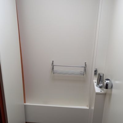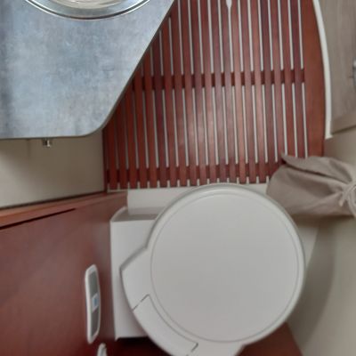 Cabinet de toilette avec WC à cassette Thetford C260CS équipé d’un système SOG, lavabo et douche en polyester séparable grâce à un paroi pivotante.