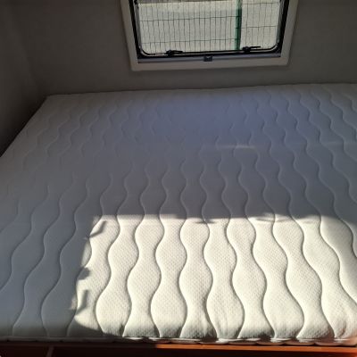 Lit transversal (140cmX190cm) à l’arrière et lit pavillon électrique (130cmX190cm) à l’avant.