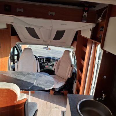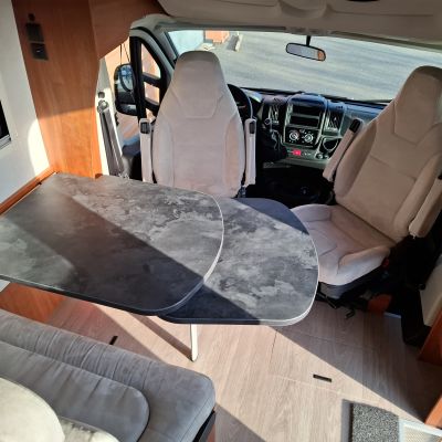 Salon composé d’une banquette 2 places face à la route et 2 sièges cabine pivotants.