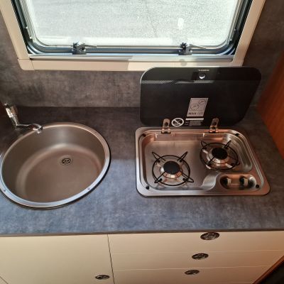 Cuisine avec réchaud 2 feux, évier inox, réfrigérateur à compression 150L.