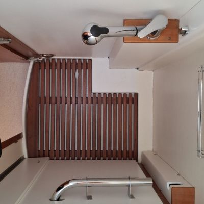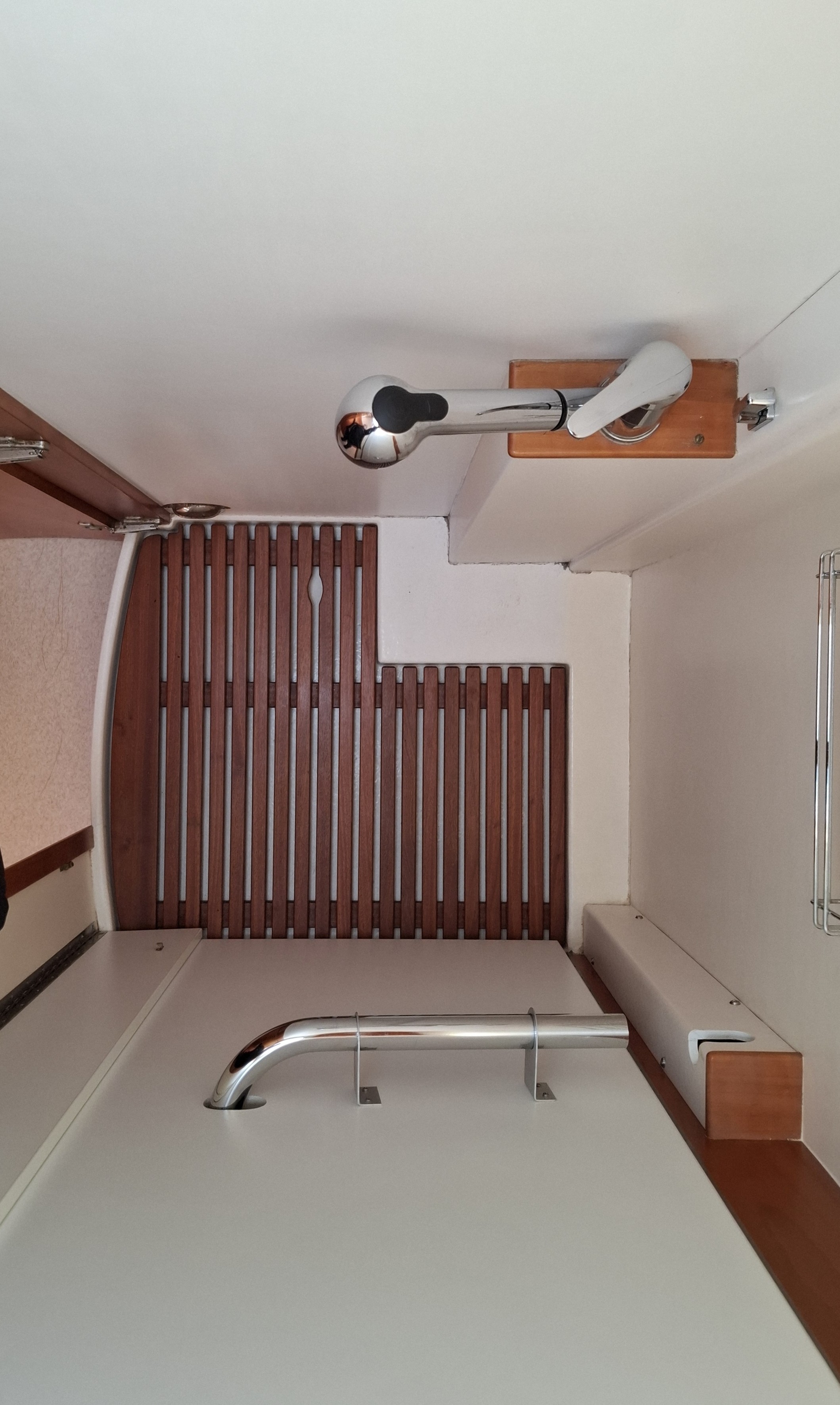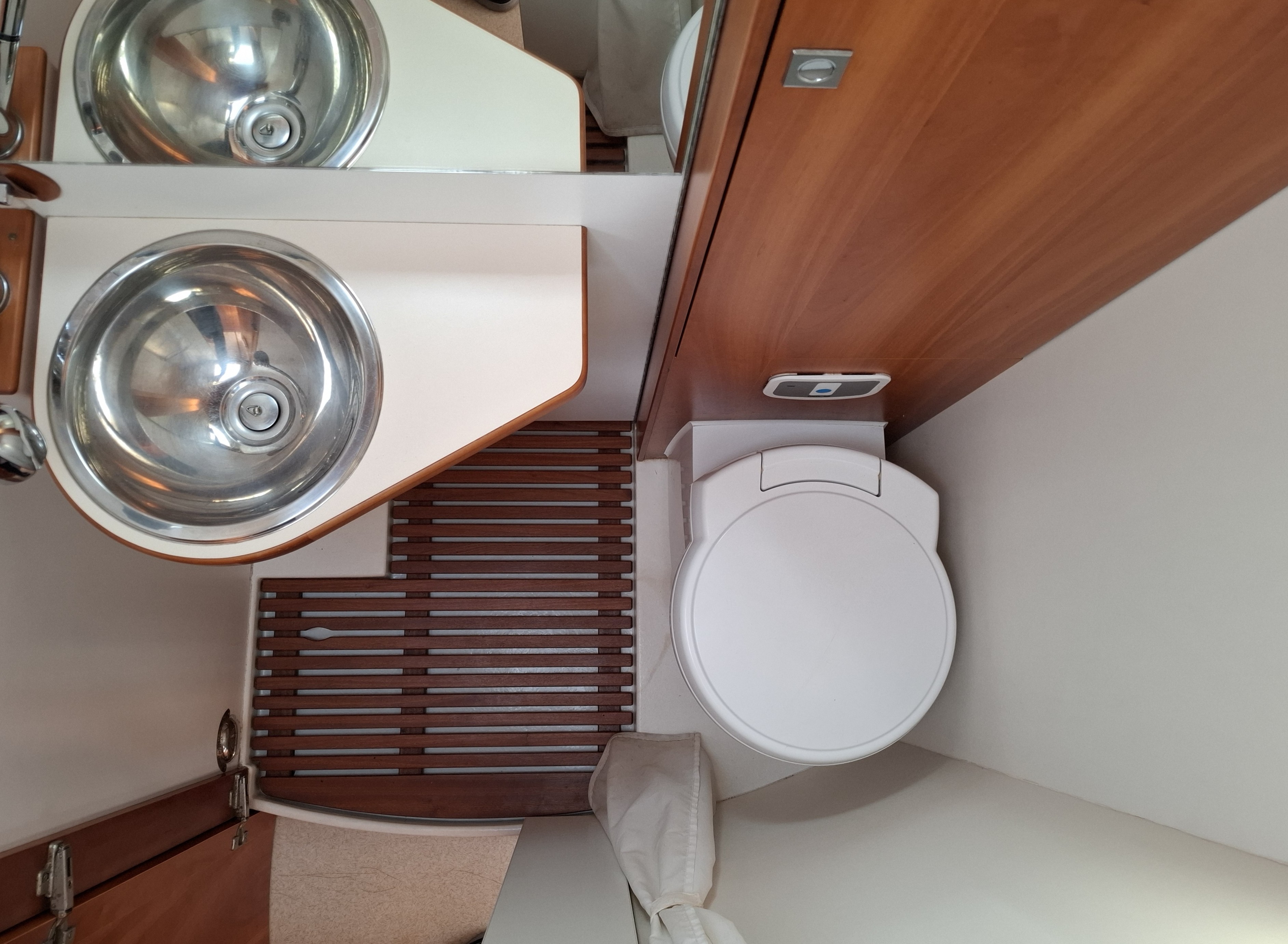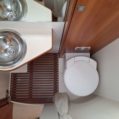 Salle d’eau avec WC à casette Thetford C260 et électrovanne de rinçage 12V, bac à douche en résine polyester, paroi pivotante et lavabo.