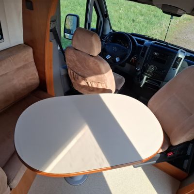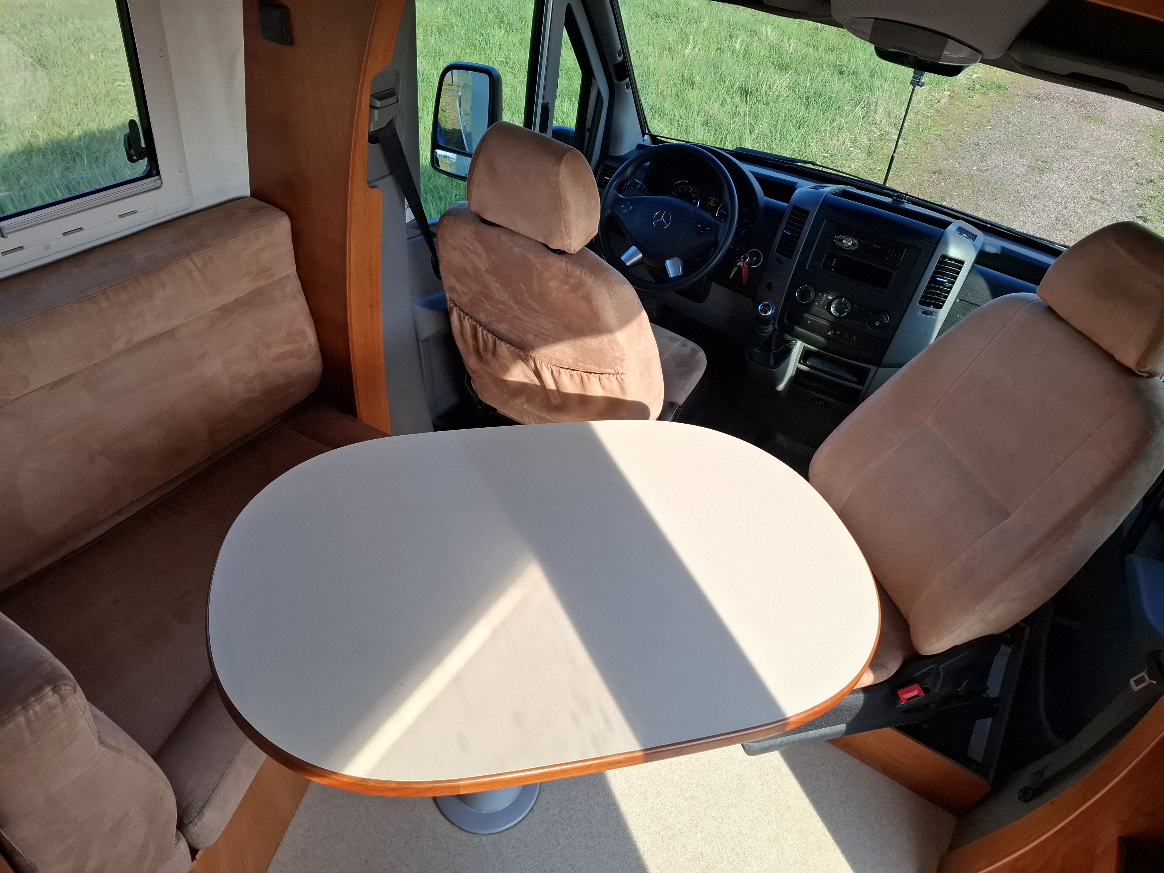 Salon composé d’une banquette en L (transformable en place assise) avec 2 sièges cabine pivotants, une table ovale (100x66)sur pied télescopique.