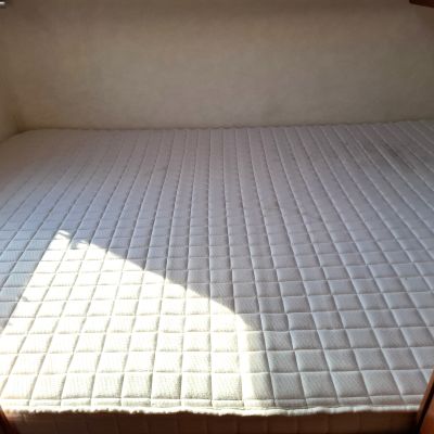 Cuisine équipée d’un réchaud 2 feux gaz, évier inox, réfrigérateur à absorption 150L.