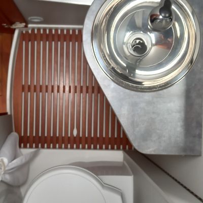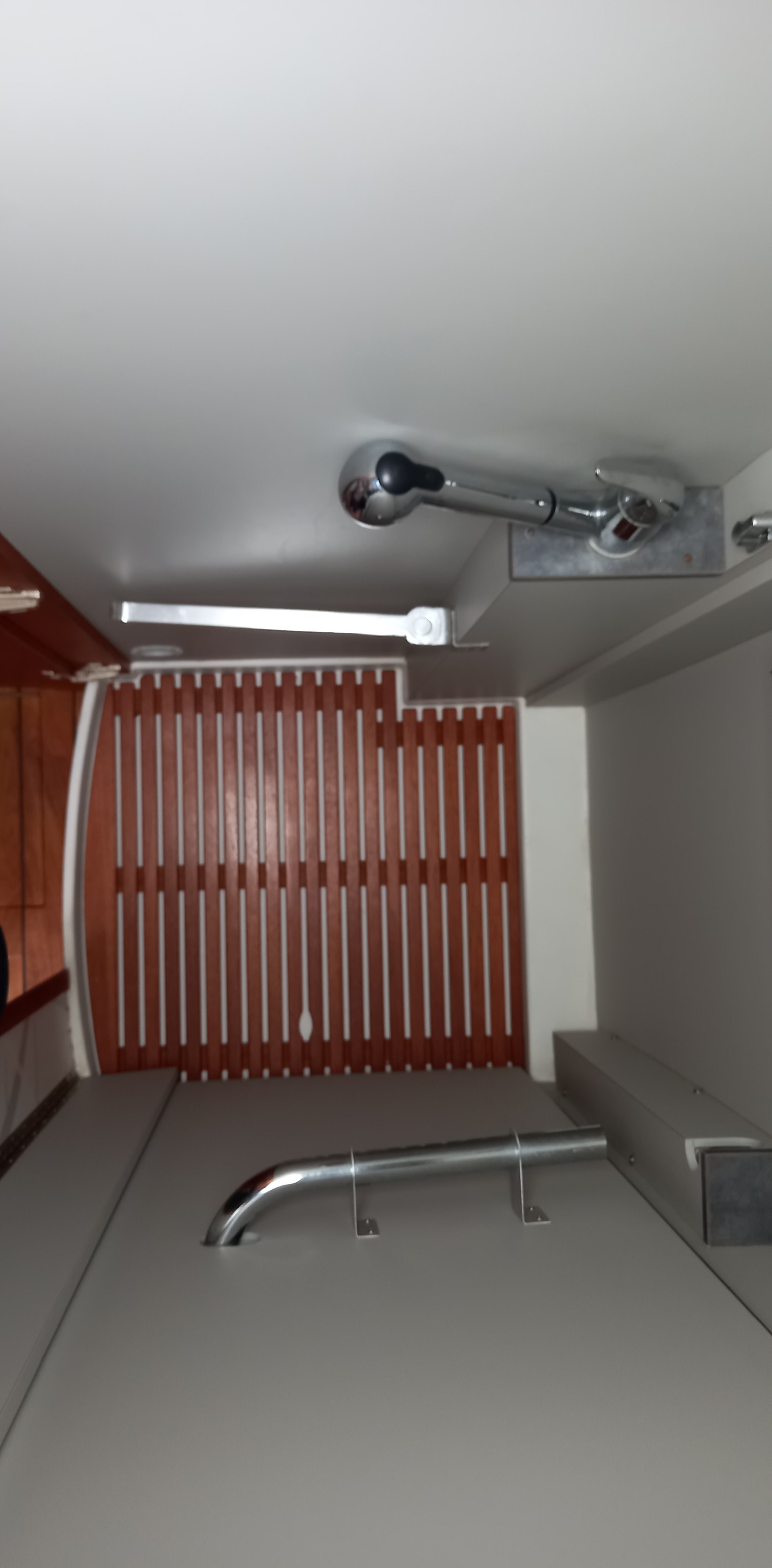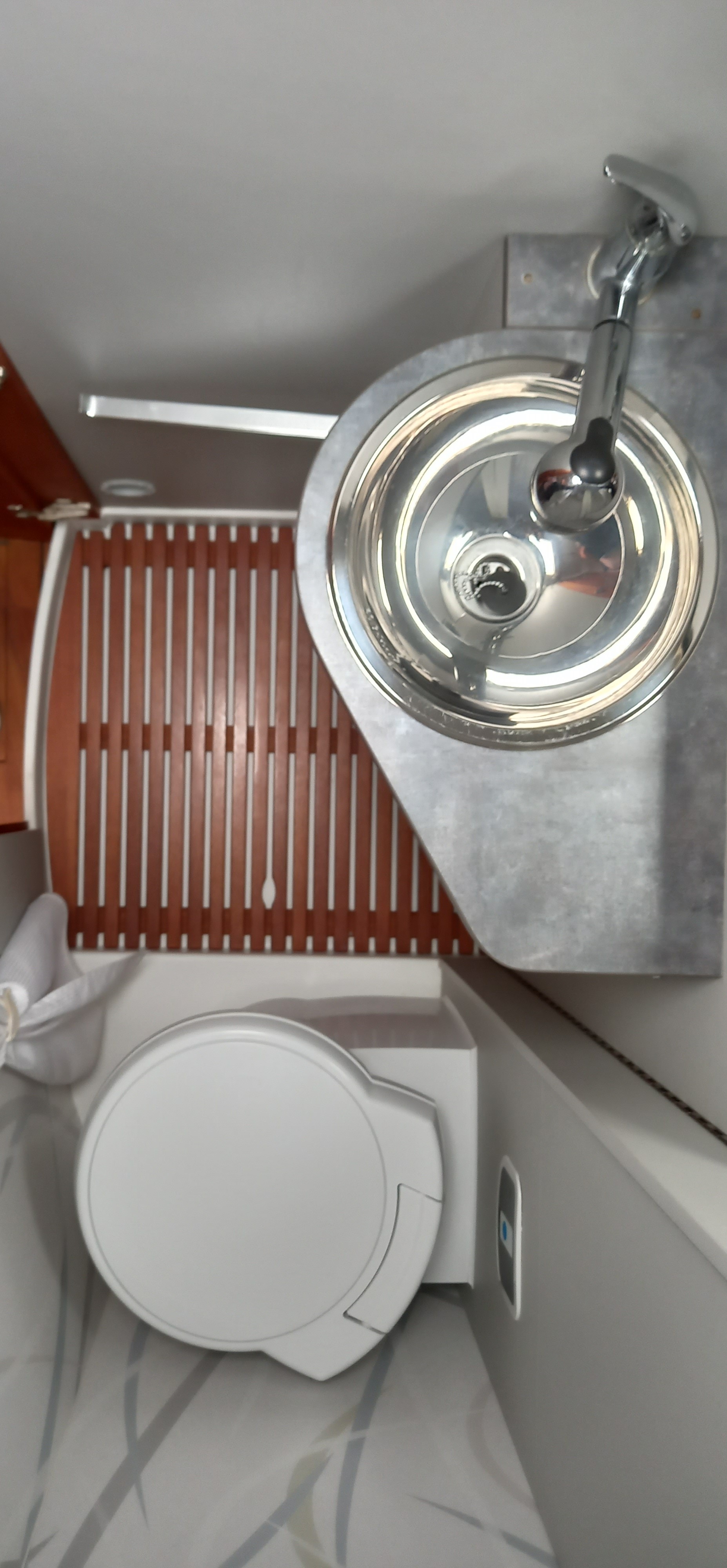 Cabinet de toilette avec WC à cassette Thetford C260 avec système SOG , lavabo et douche en polyester séparable grâce à une paroi pivotante.