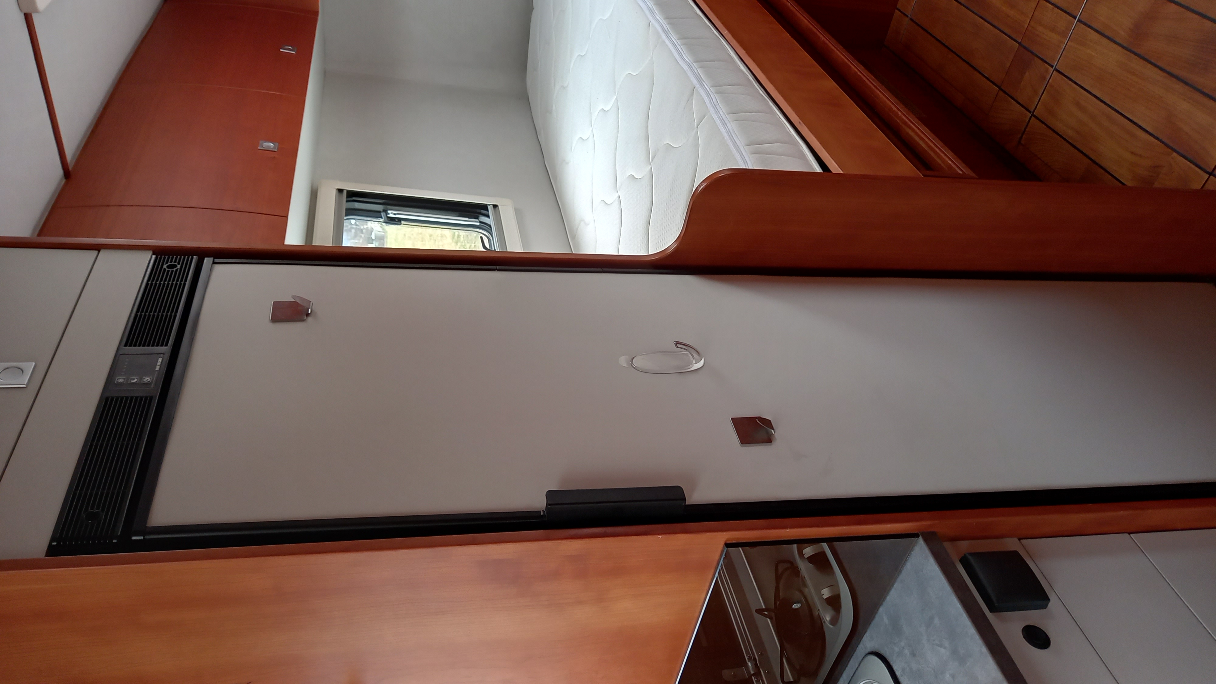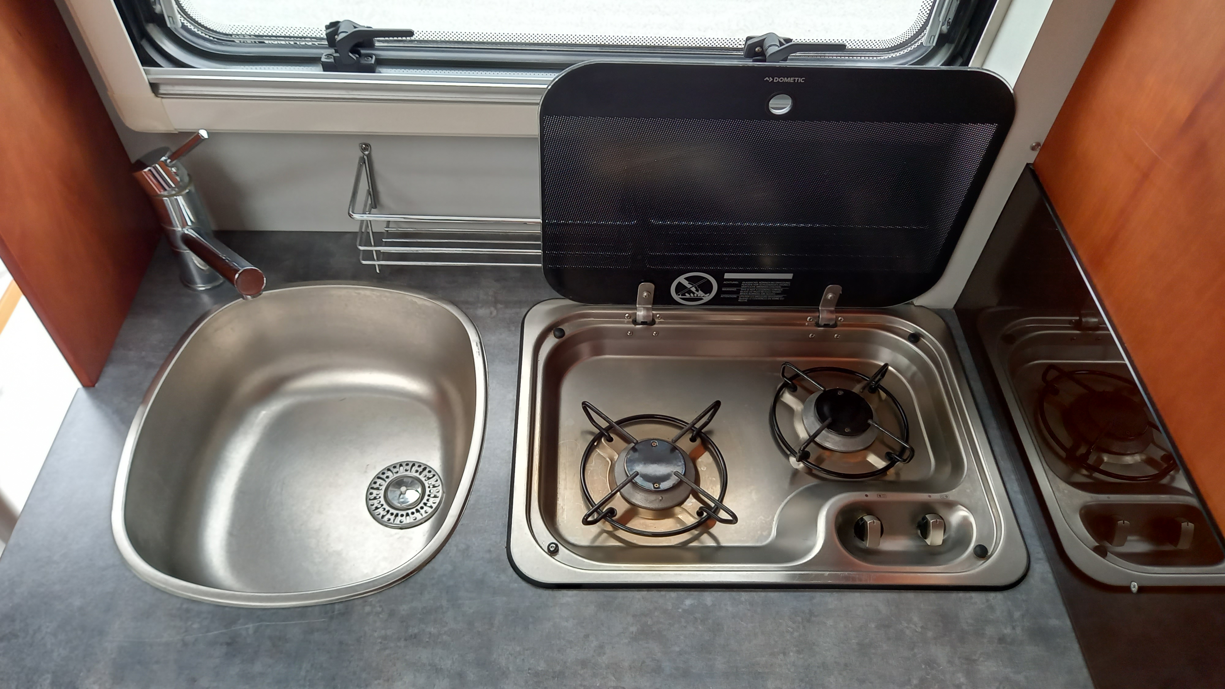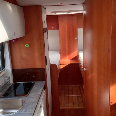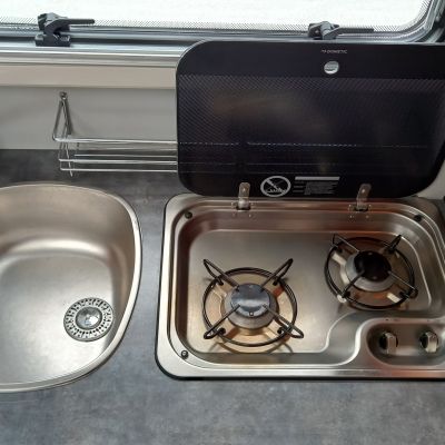 Cuisine équipée d’un réchaud 2 feux, évier inox, réfrigérateur à compression Thetford 152 L avec freezer.