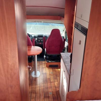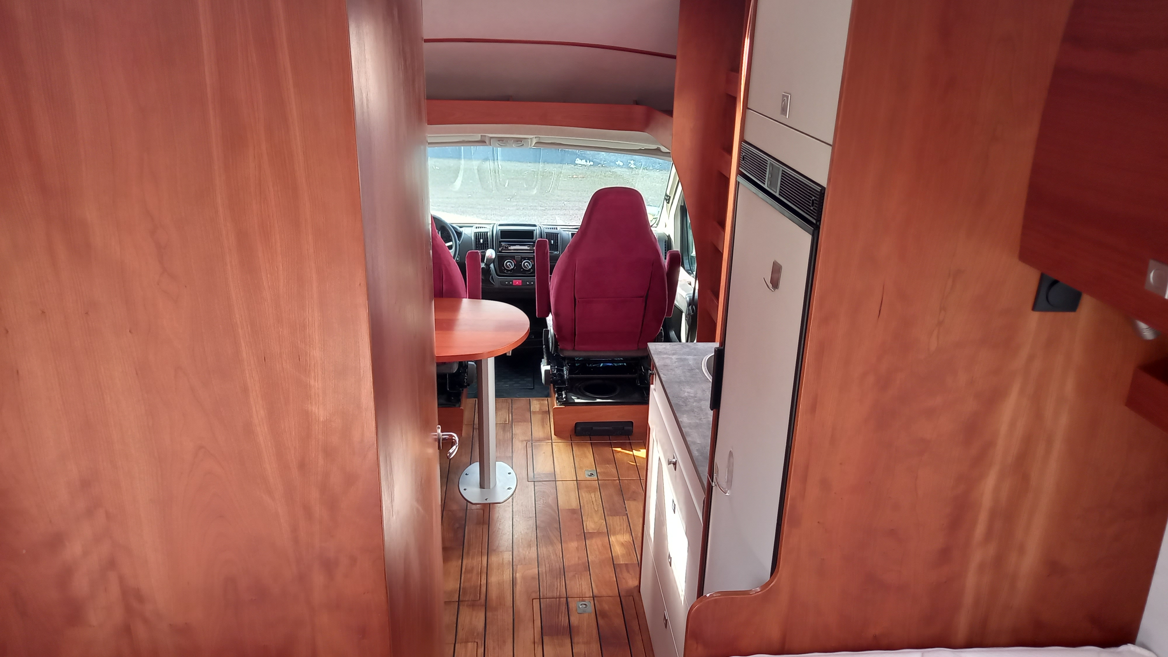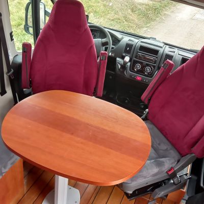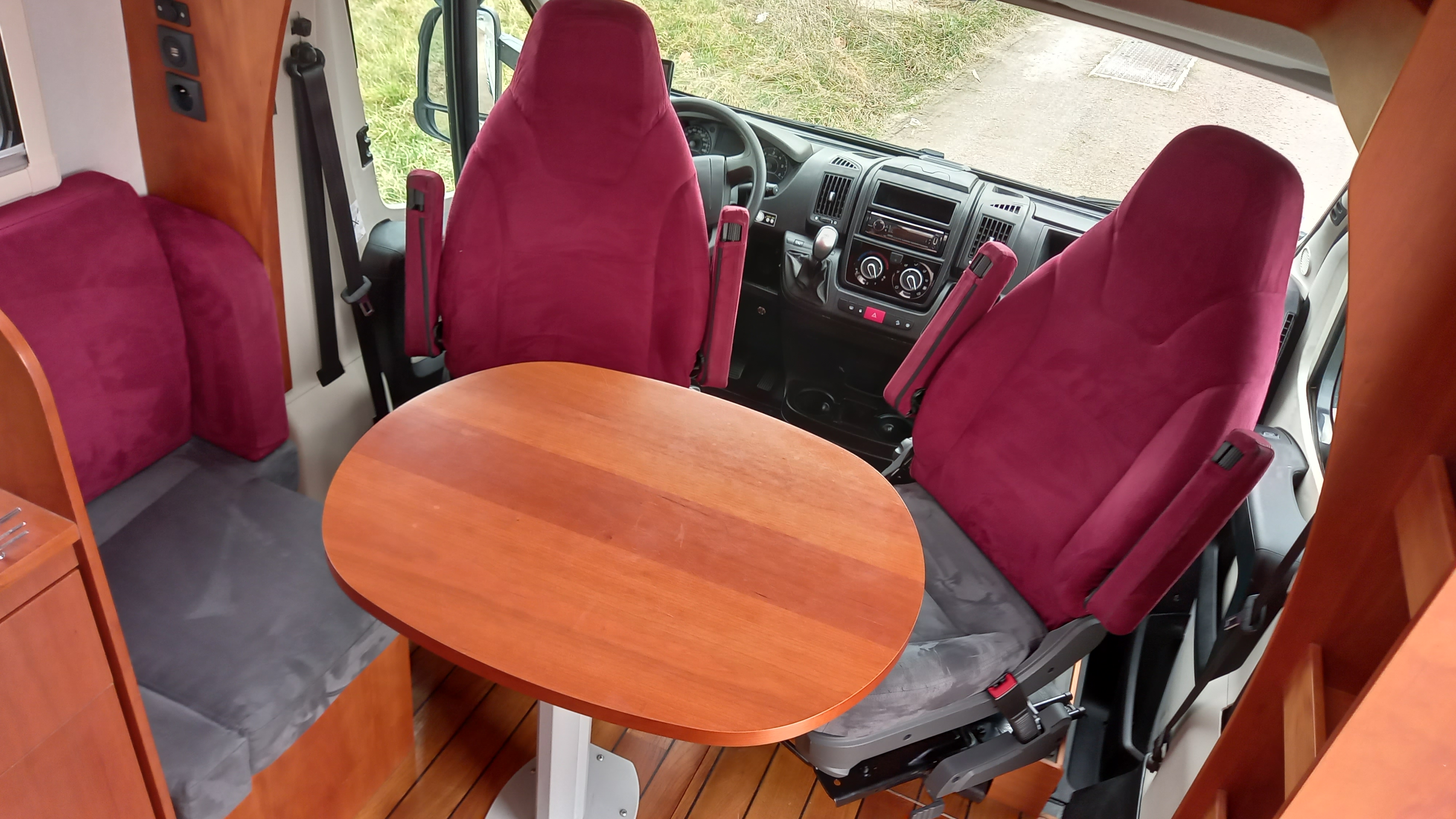 Salon composé d’une banquette 1 place face à la route et 2 sièges cabine pivotants, table ovale sur pied télescopique.