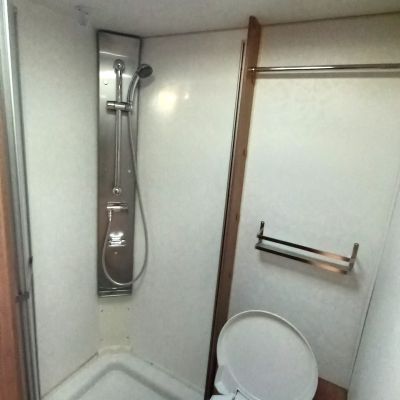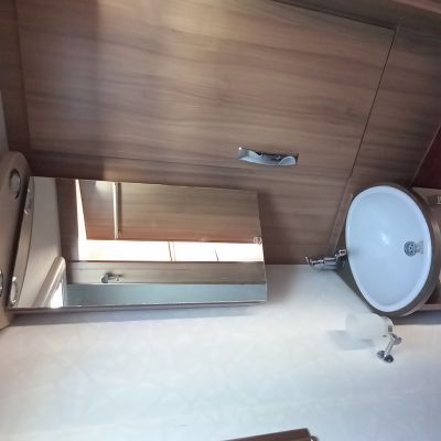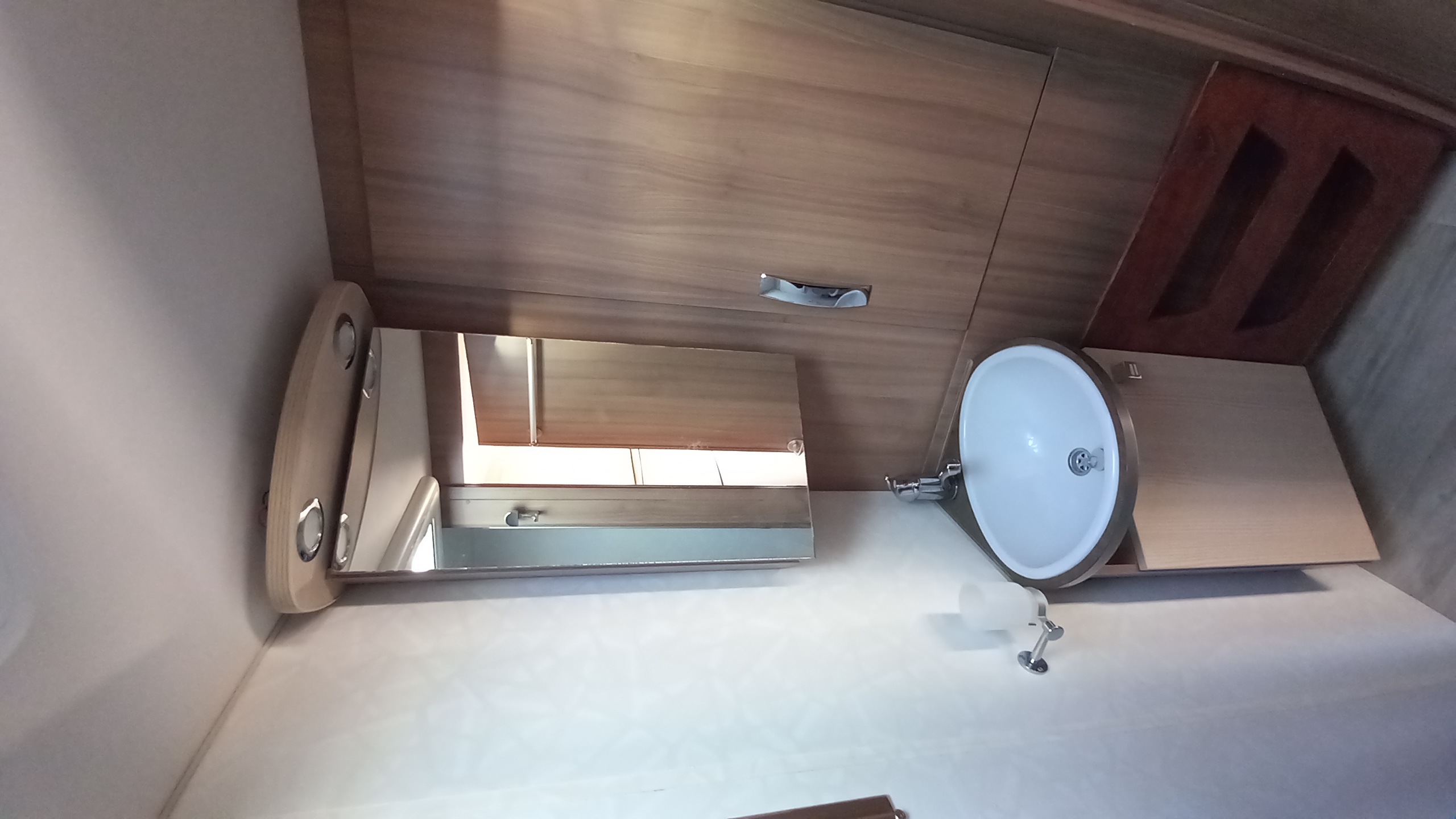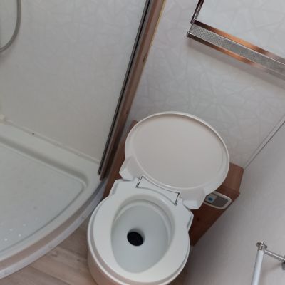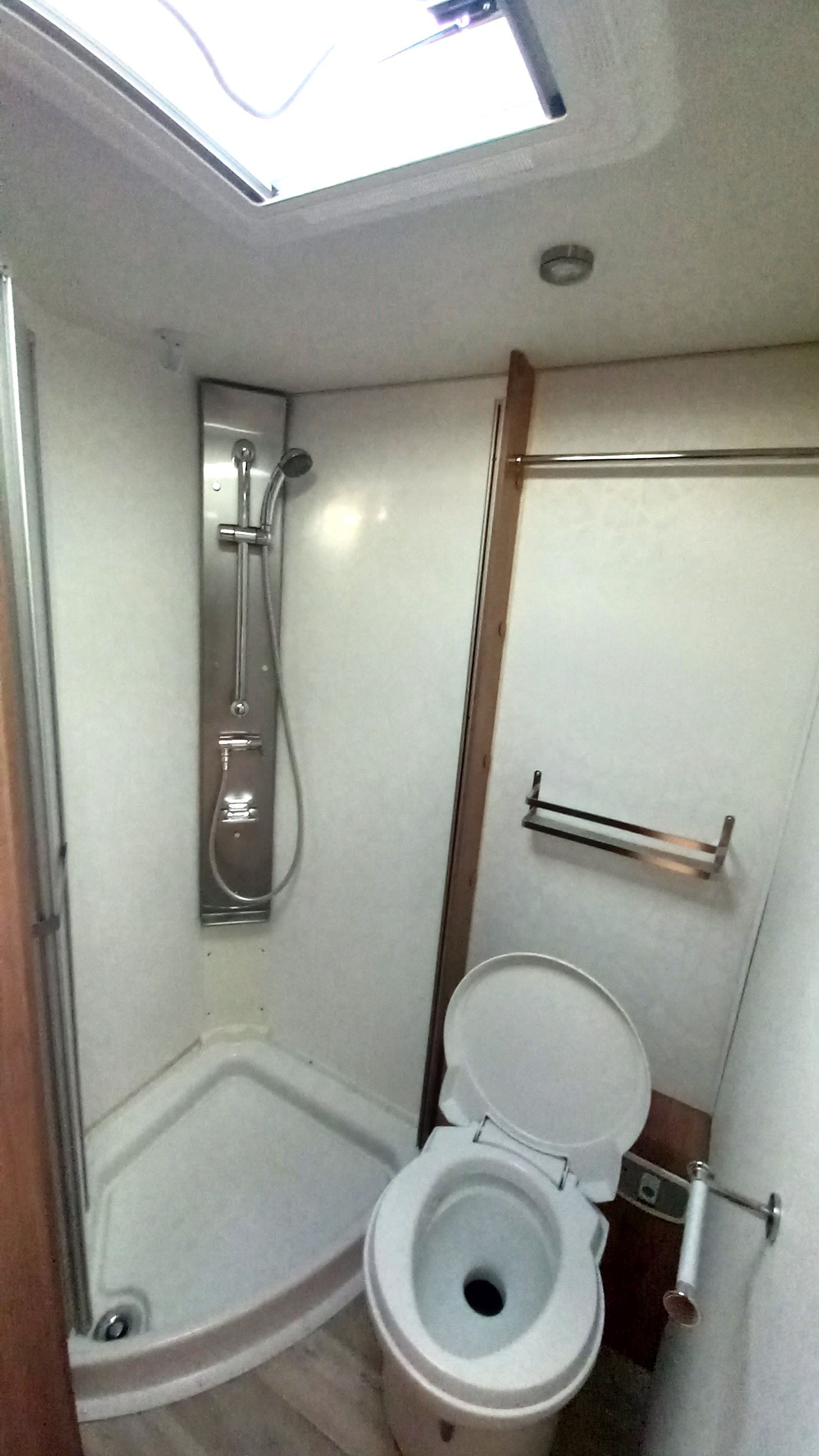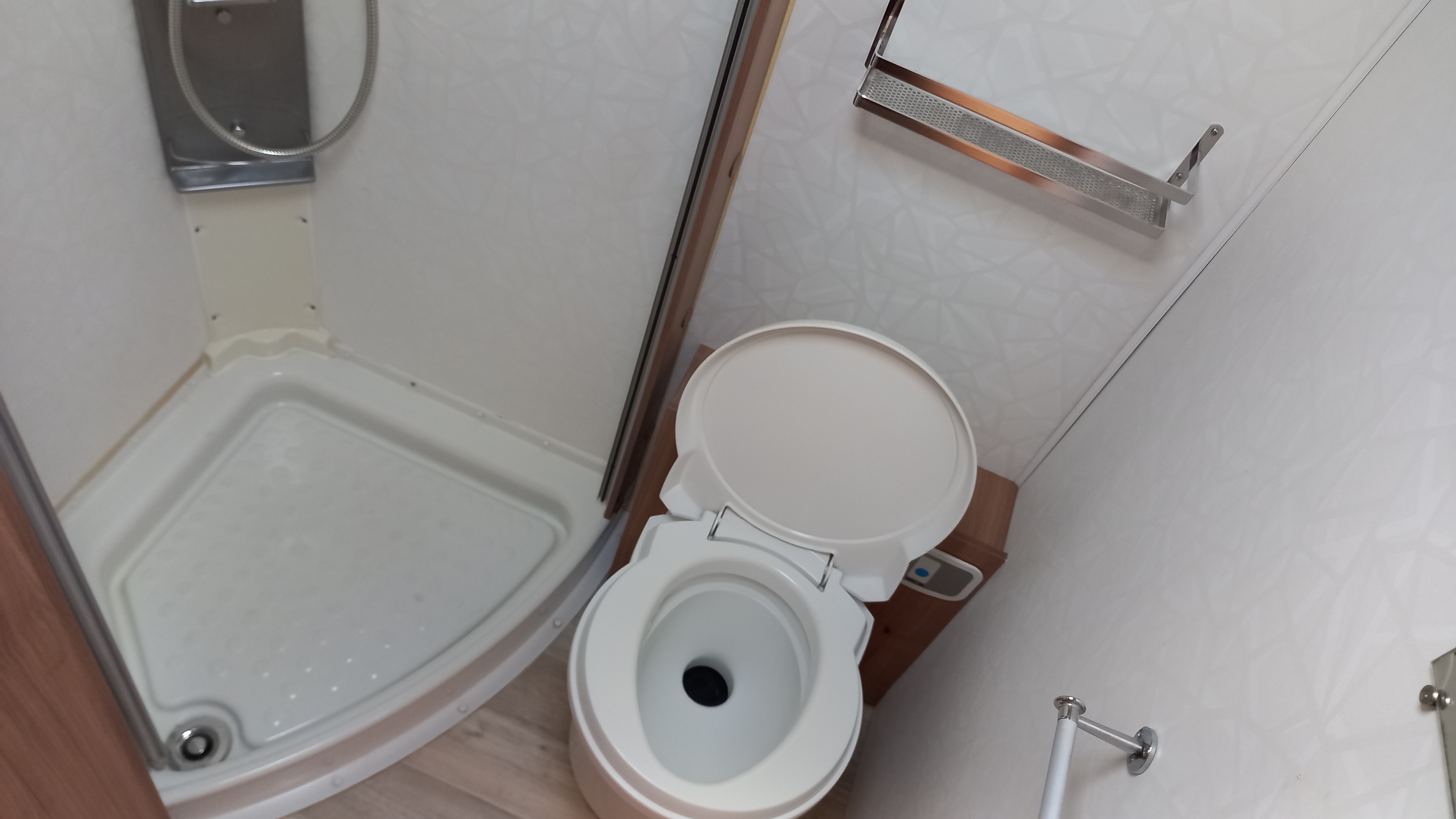 Salle d’eau avec WC à cassette Thetford et lavabo, douche séparée.