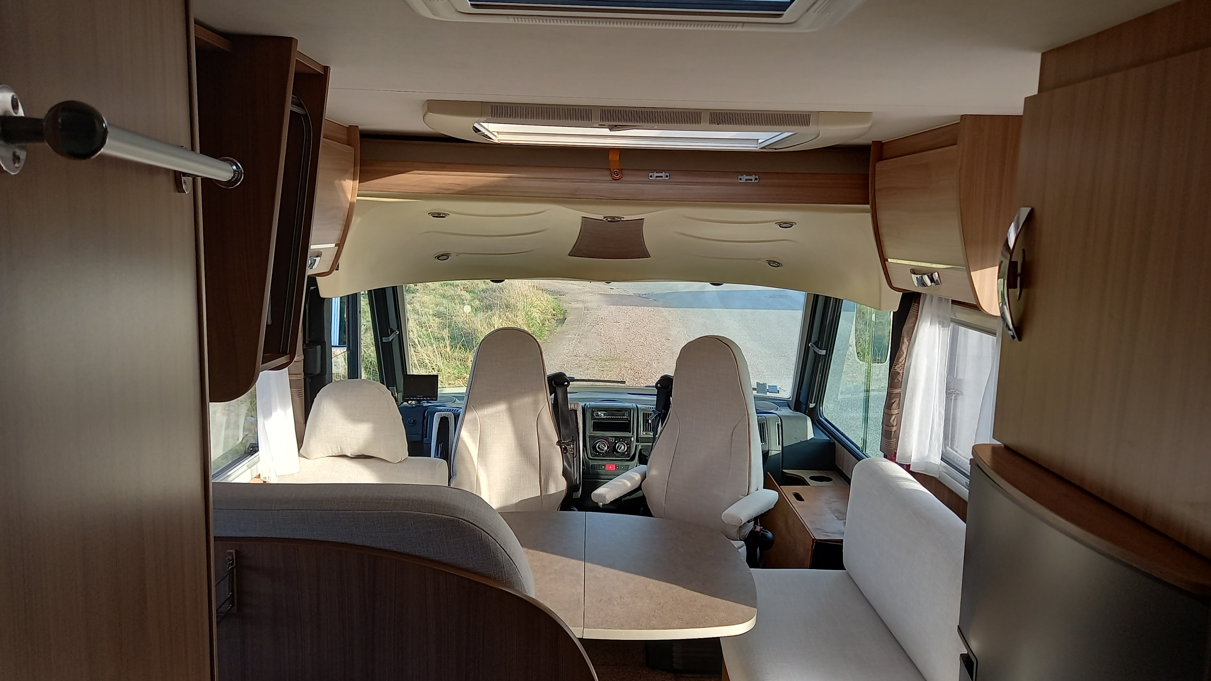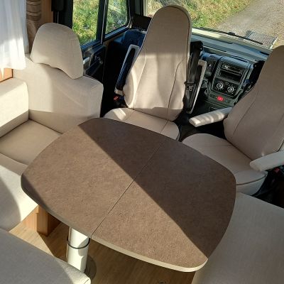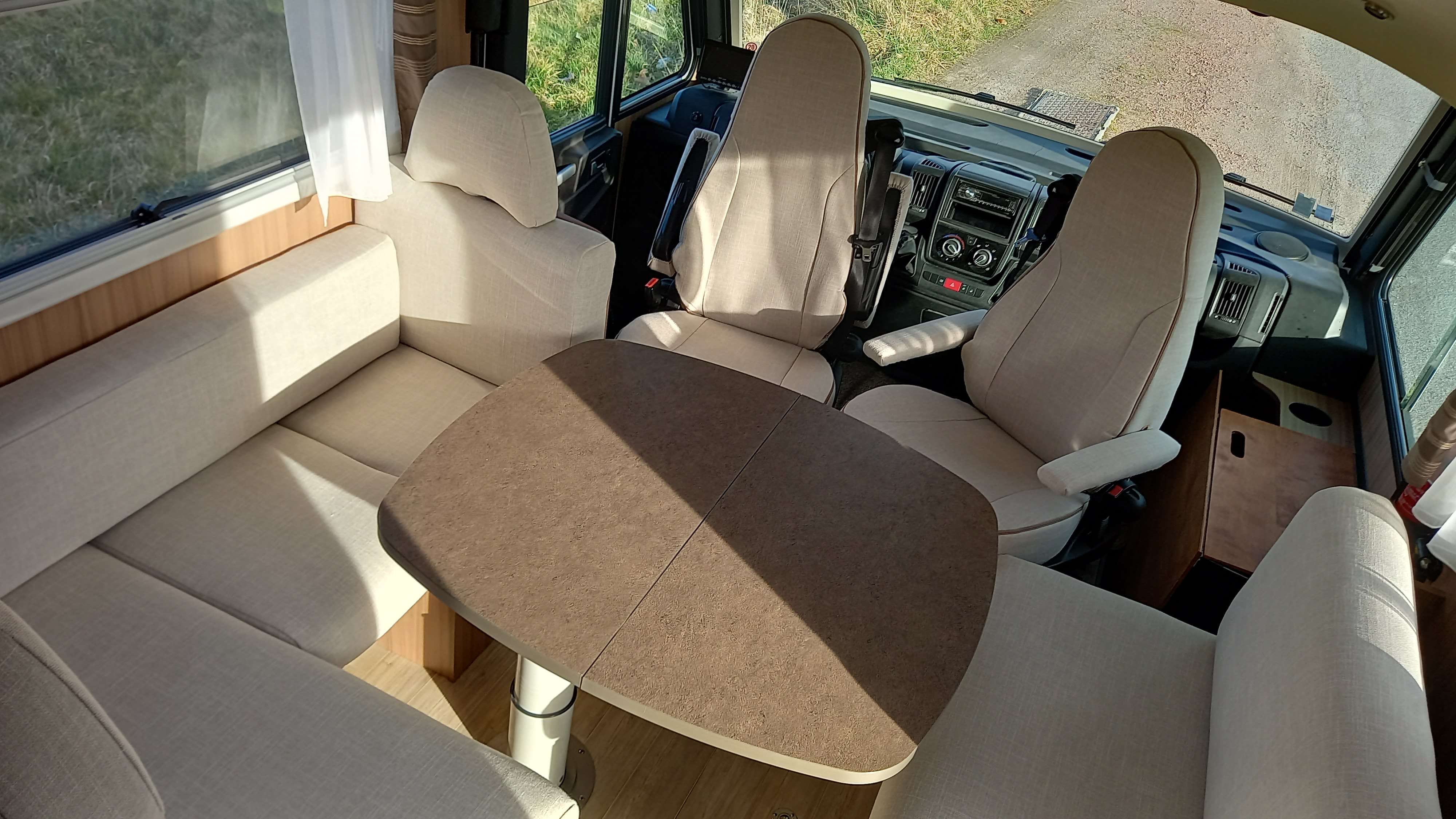 Salon composé d’une banquette en U avec 2 places carte grise, une banquette latérale 1 place carte grise et 2 sièges cabine pivotants. Le salon se transforme en couchage 2 personnes (140x200).