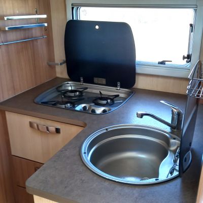 Cuisine avec réchaud 3 feux, évier en inox, réfrigérateur Dometic 160L trimixte avec Freezer.