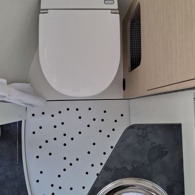 Salle d’eau avec toilette sèche à séparation TINY avec réservoir urine intégré 8L et bac à douche en polyester séparable grâce à une paroi pivotante.