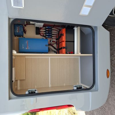 Chauffage/chauffe eau TRUMA Combi D6 CP Plus Gasoil, installation électrique Victron, 2 batteries lithium 150Ah, convertisseur 1600W, 2 panneaux solaires 160W, compartiment à gaz pour 1 bouteille camping-gaz.