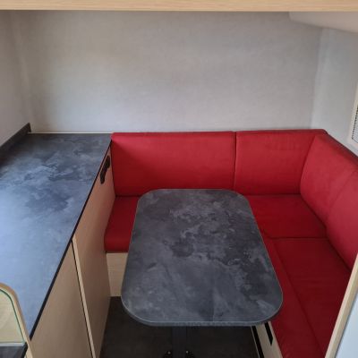 Salon composé d’une banquette en L à l’arrière du véhicule.