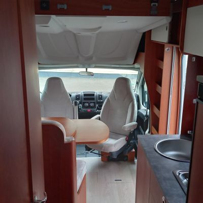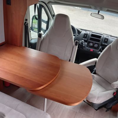 Salon composé d’une banquette 2 places face à la route et 2 sièges cabine pivotants.
