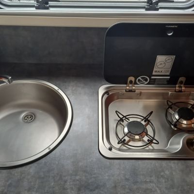Cuisine avec réchaud 2 feux, évier inox, réfrigérateur à compression 150L.