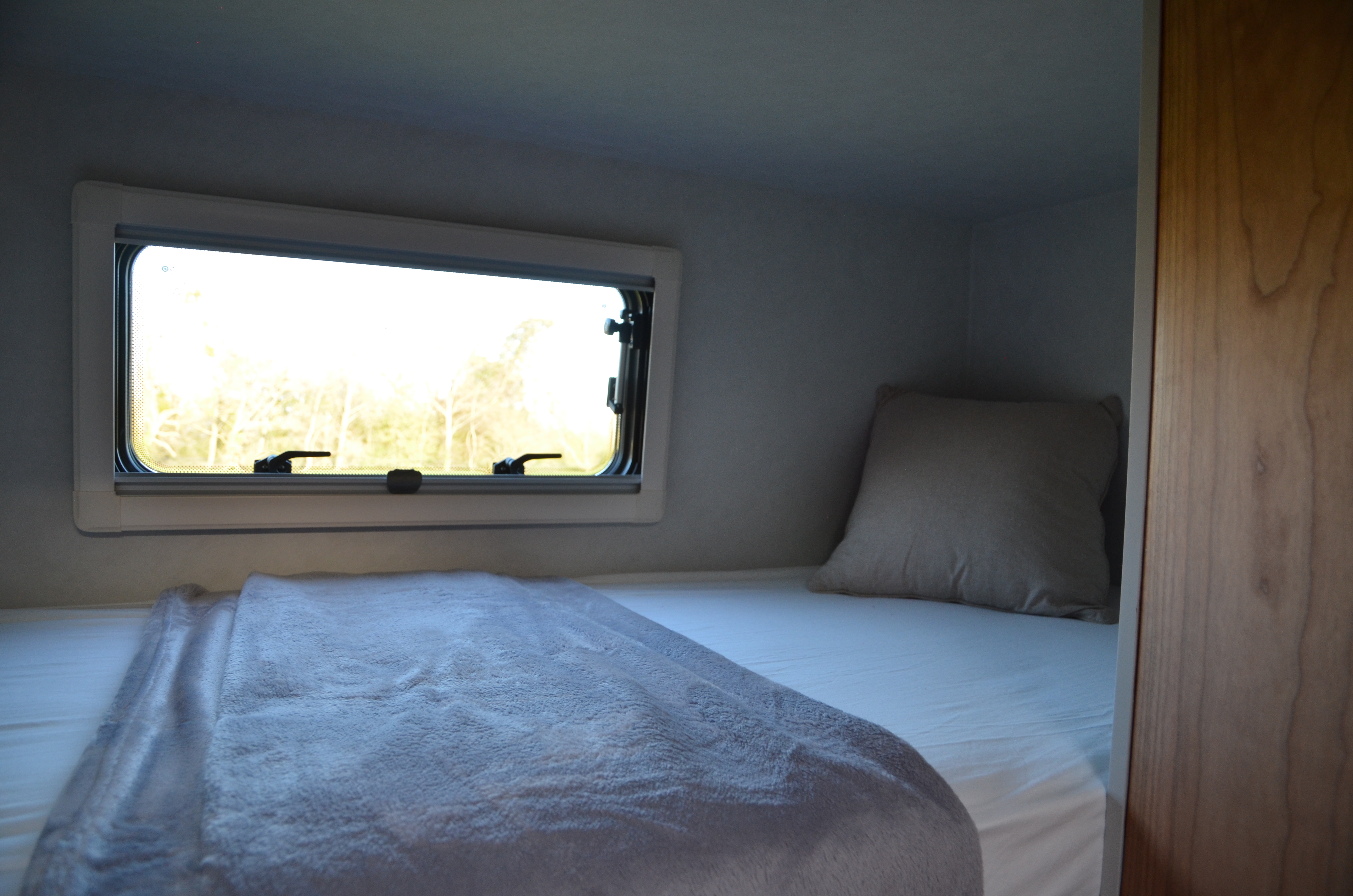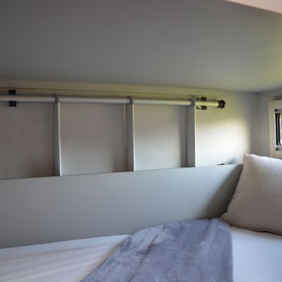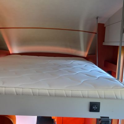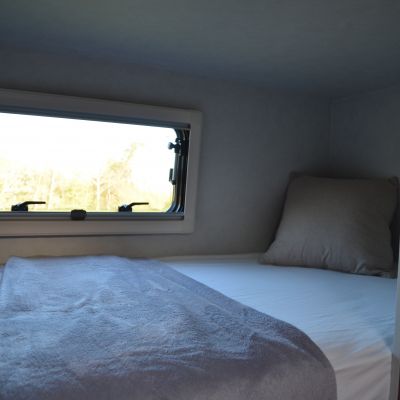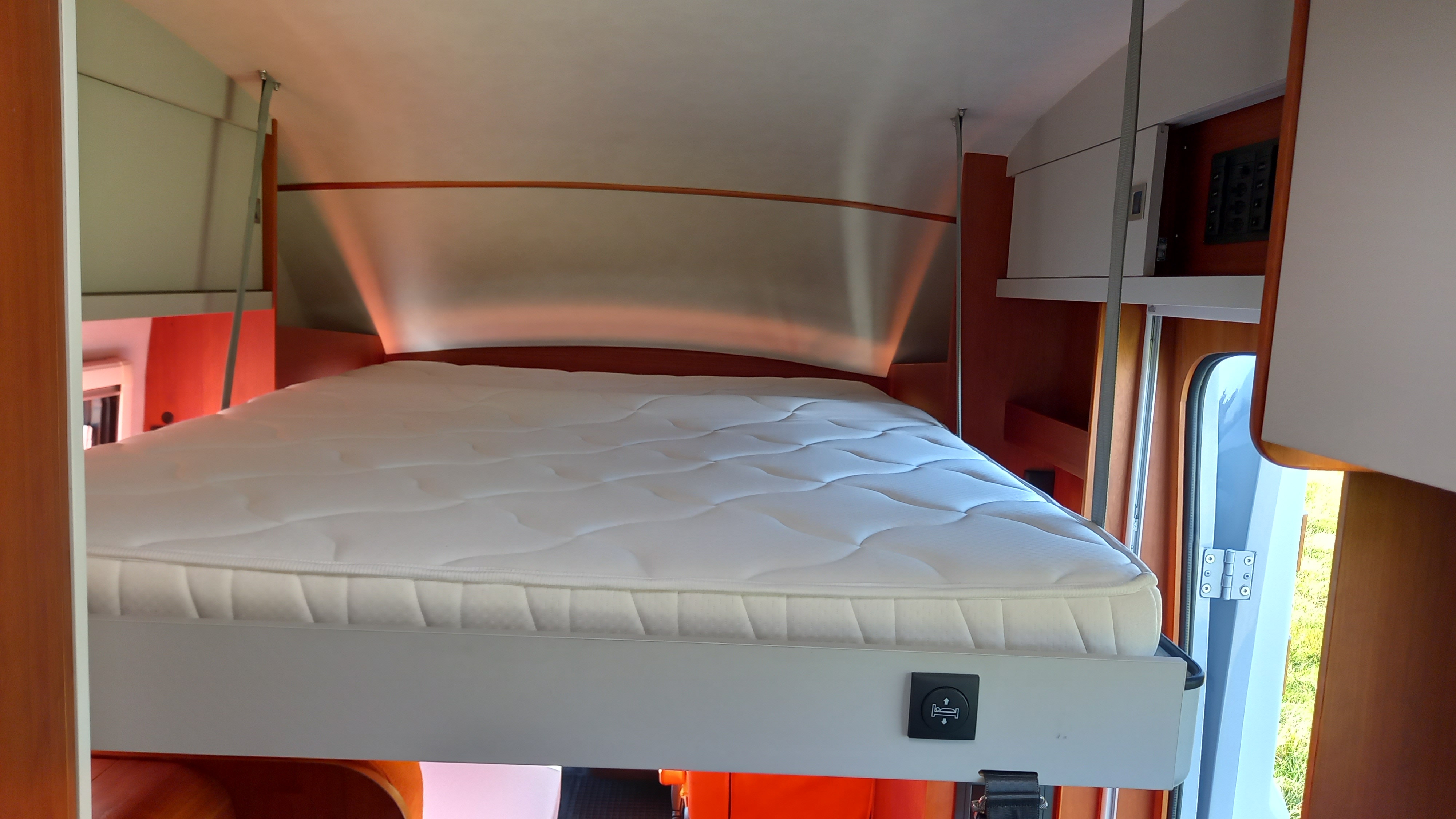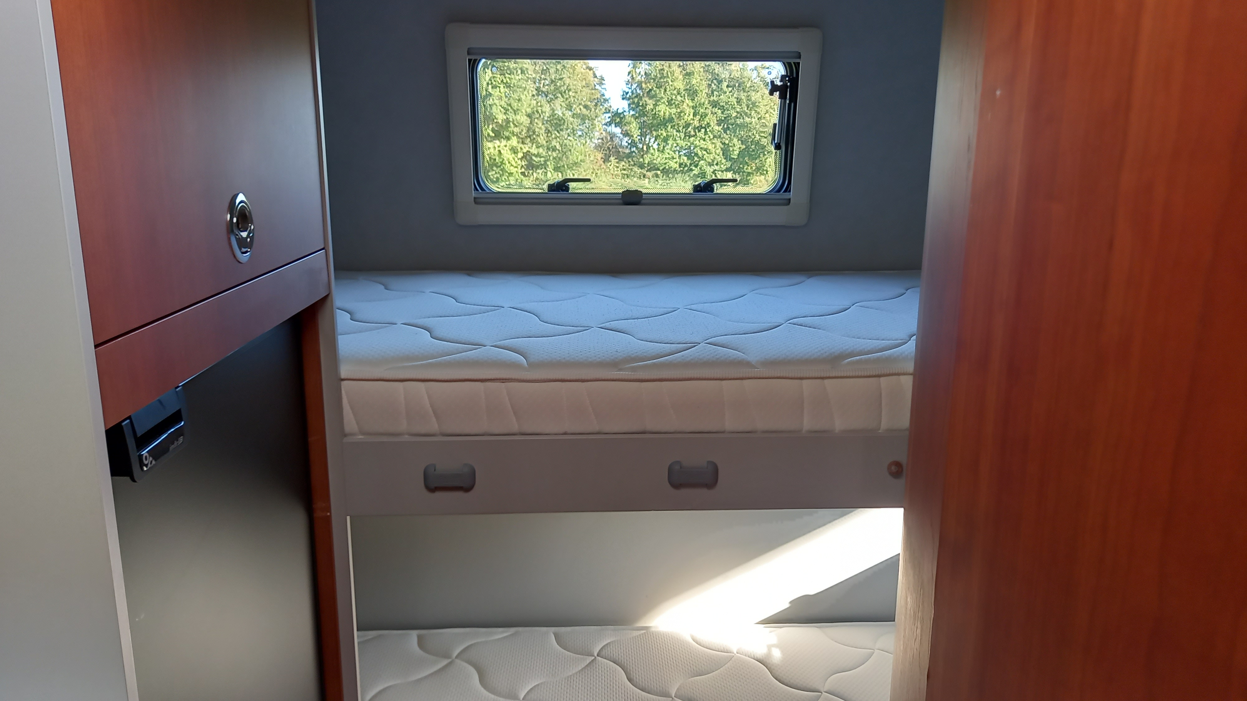 Lits superposés (80cmX190cm) à l’arrière et lit pavillon électrique (130cmX190cm) à l’avant.