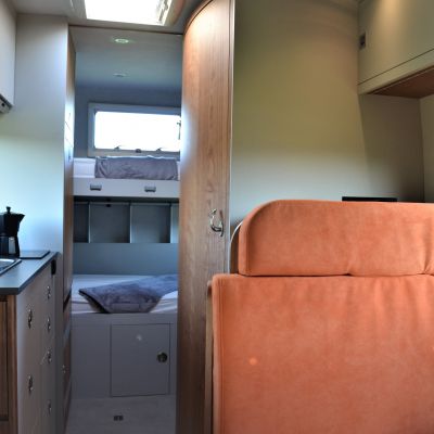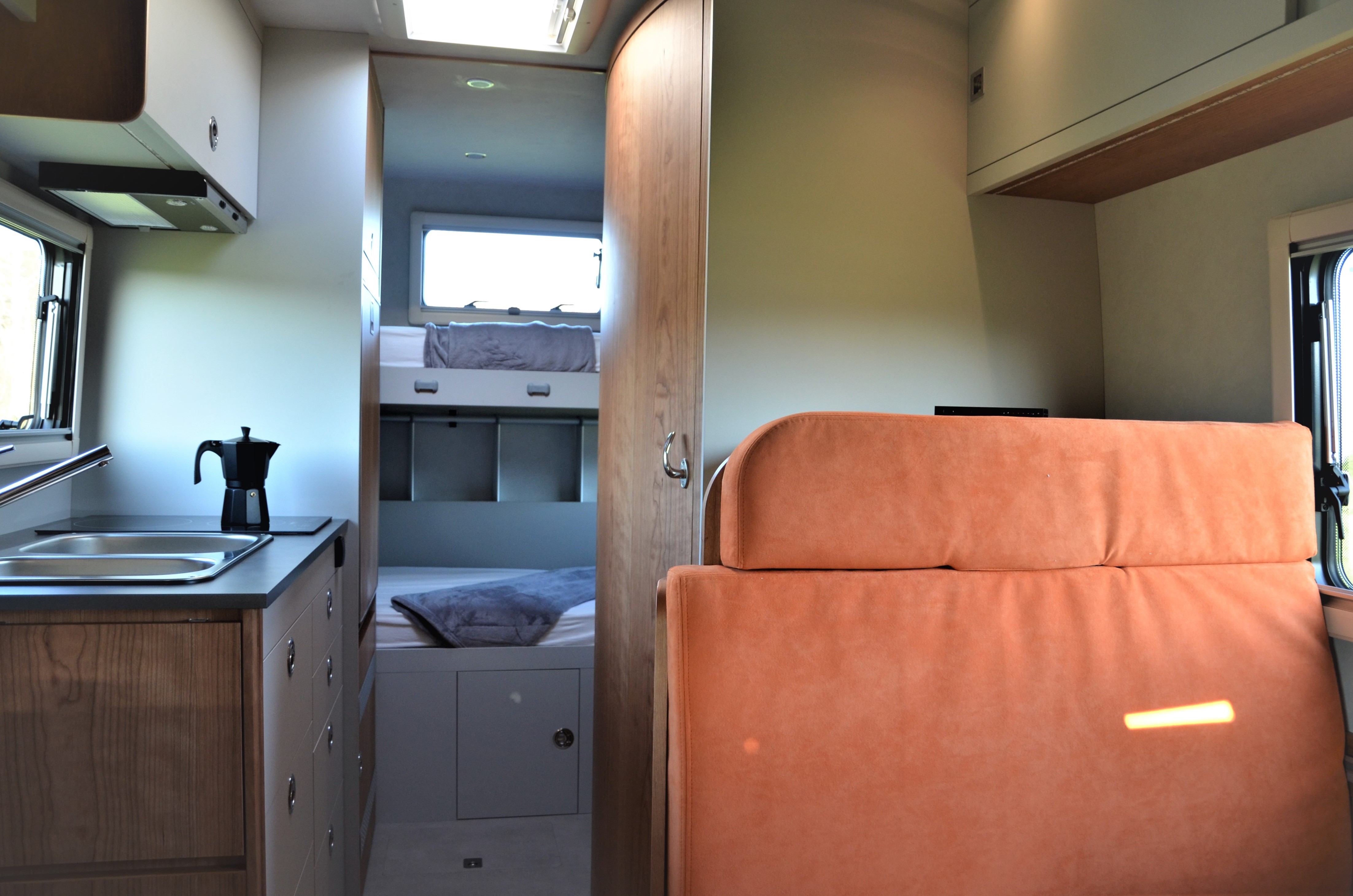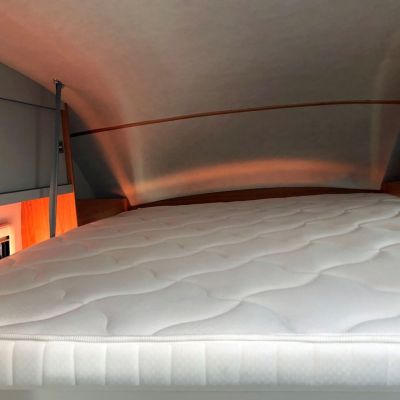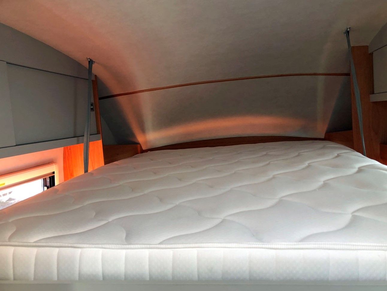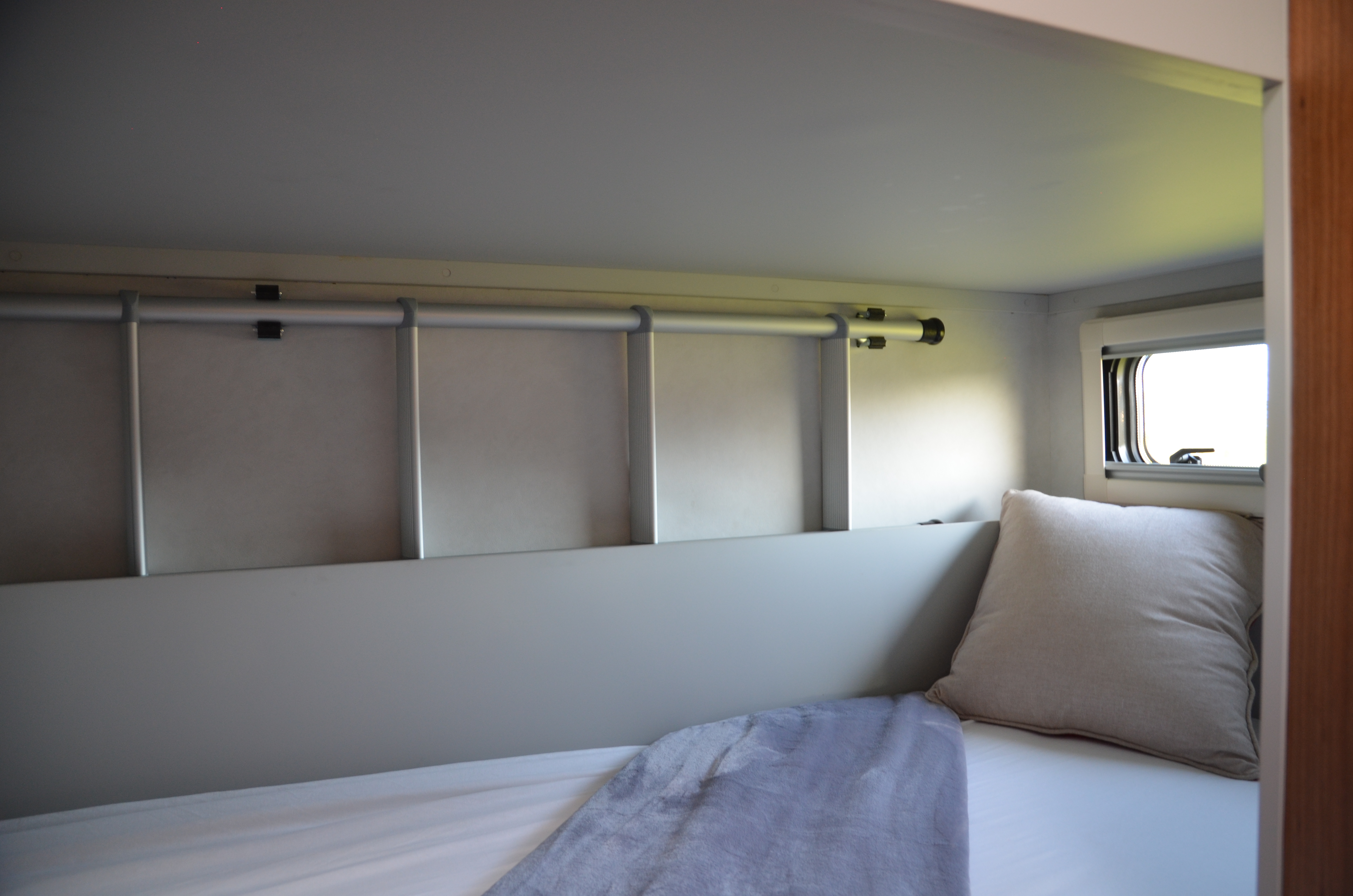 Lits superposés (80cmX190cm) à l’arrière et lit pavillon électrique (130cmX190cm) à l’avant.