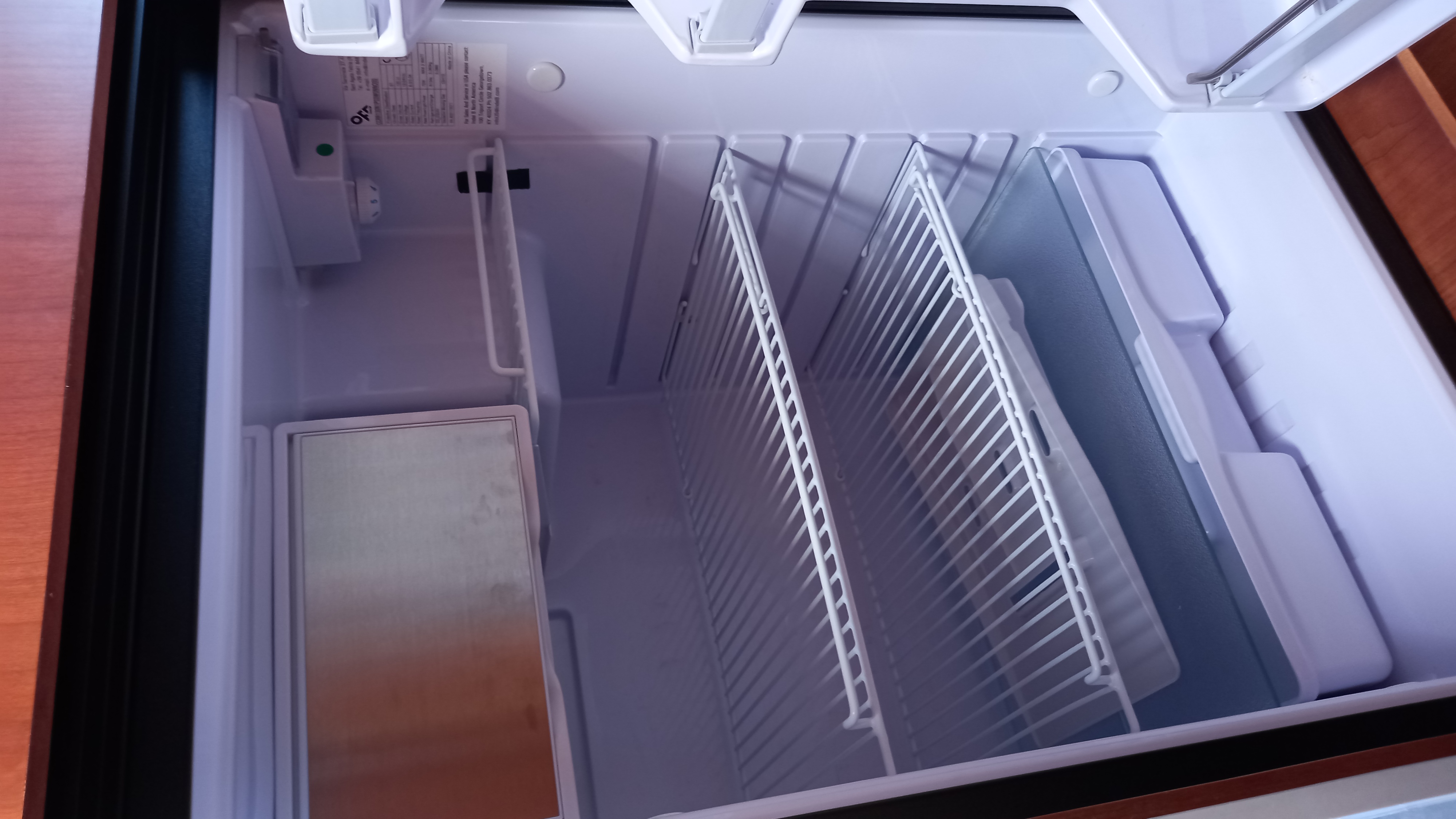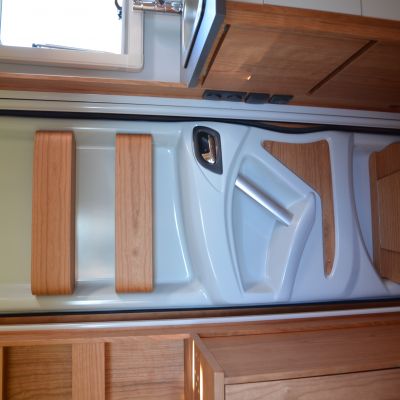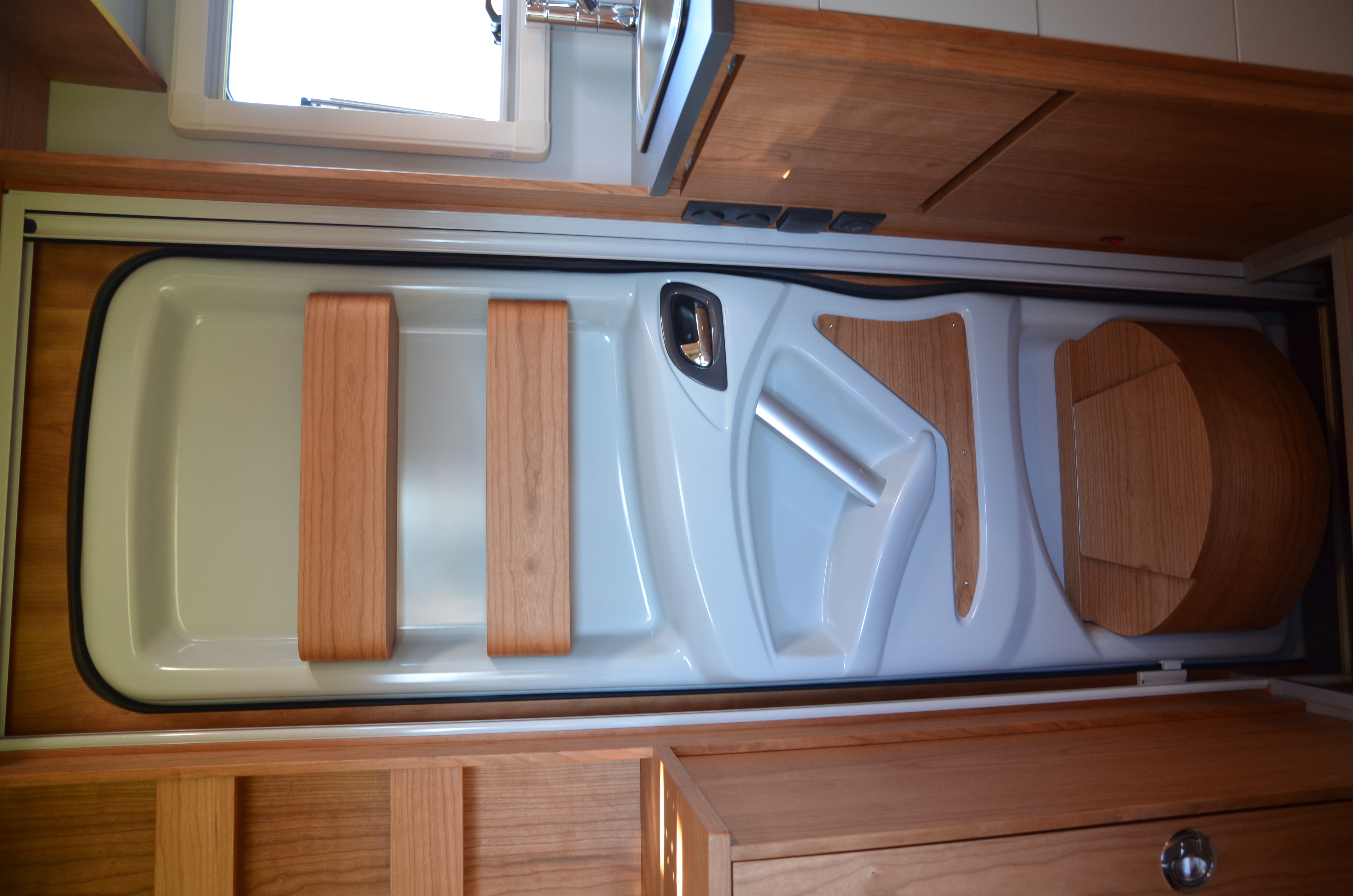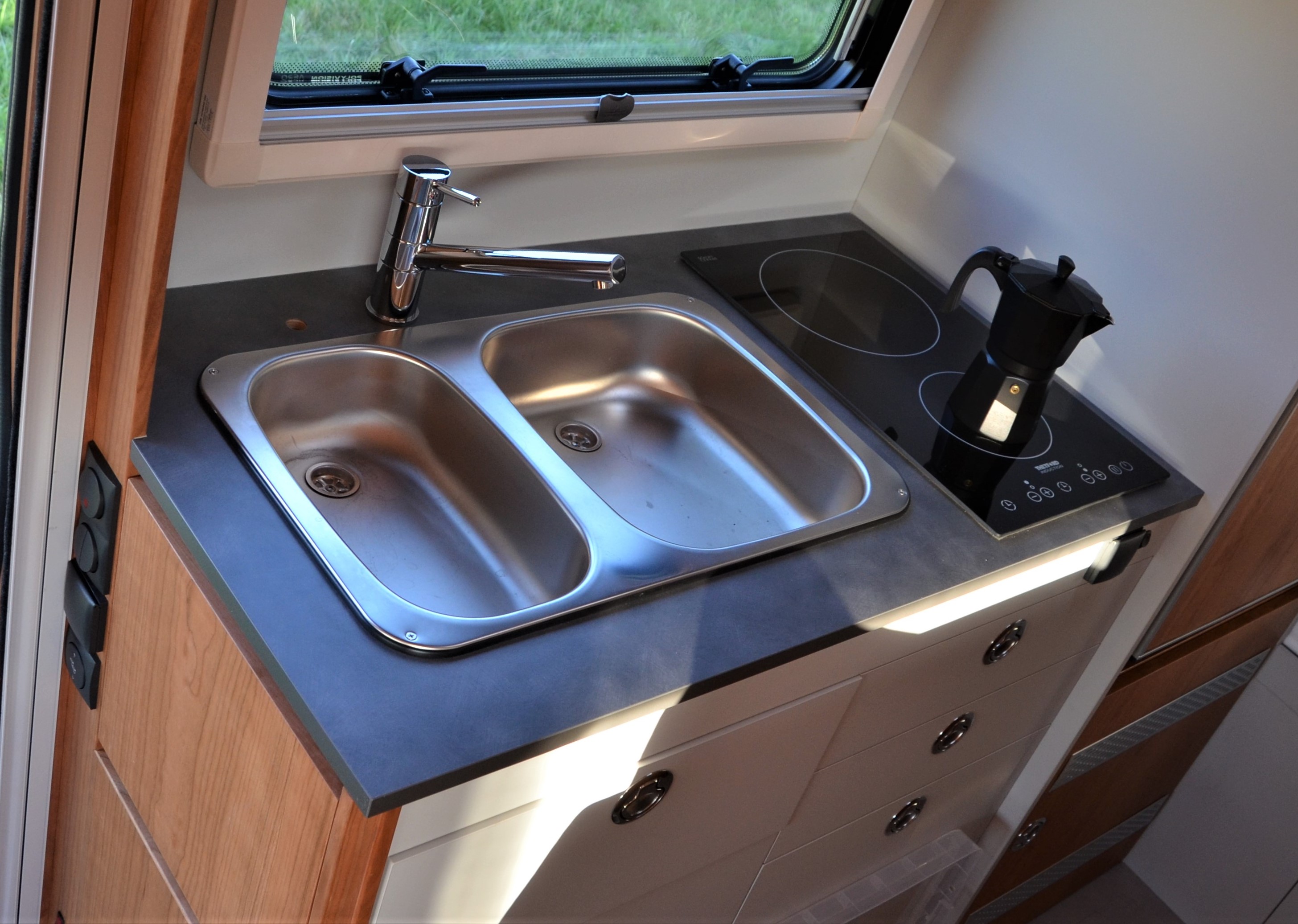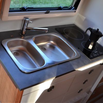 Cuisine avec plaque à induction 2 feux, hotte Dometic, évier inox avec 2 bacs, réfrigérateur à compression 130L.