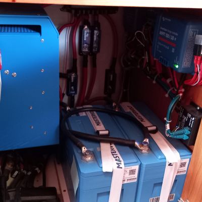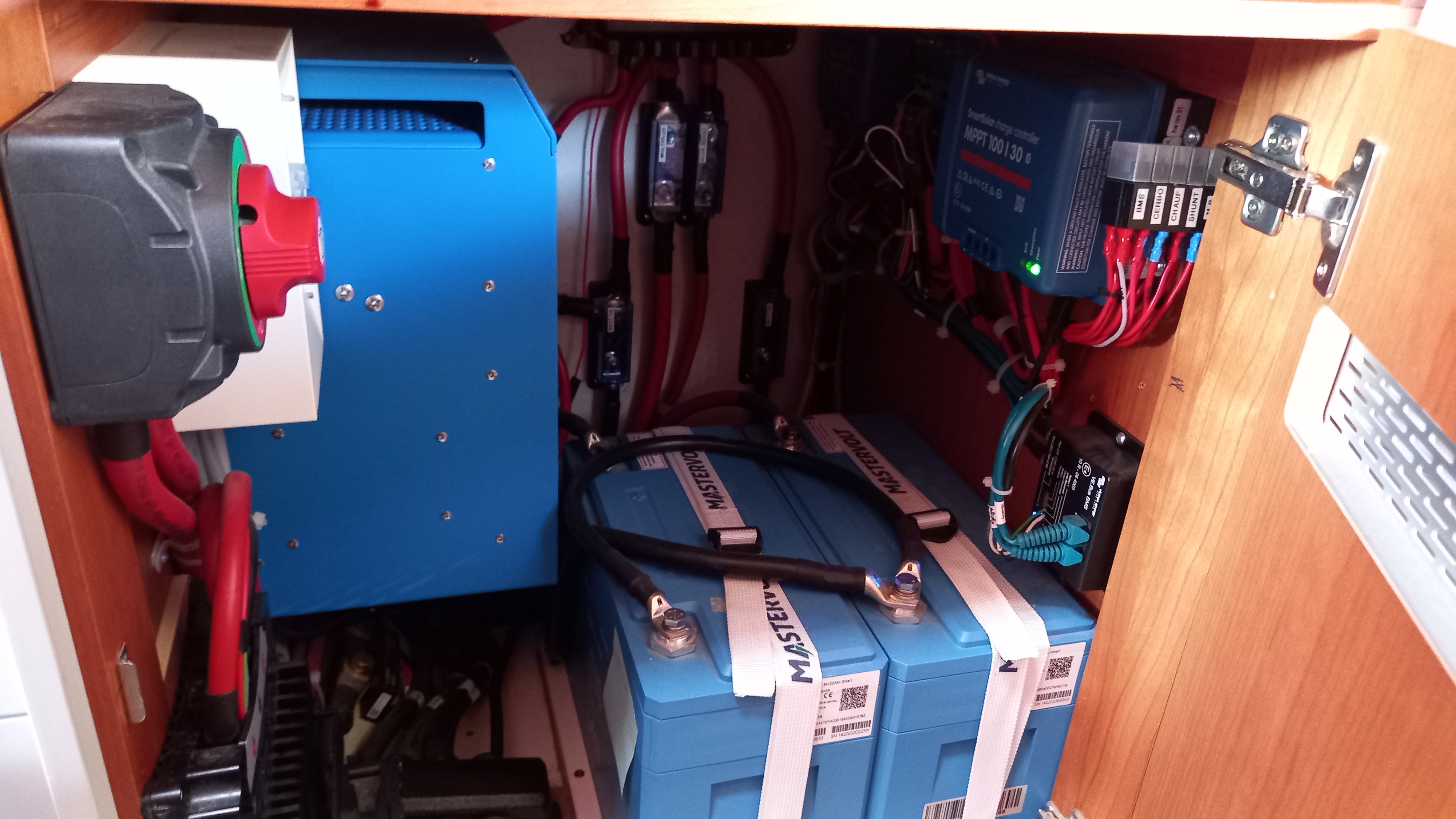 Chauffage/chauffe eau TRUMA Combi D6 CP Plus Gasoil + kit altitude, installation électrique Victron, 2 batteries lithium 200Ah, convertisseur 3000W, 2 panneaux solaires 150W.