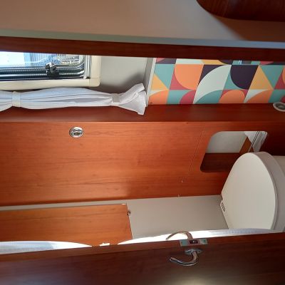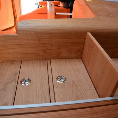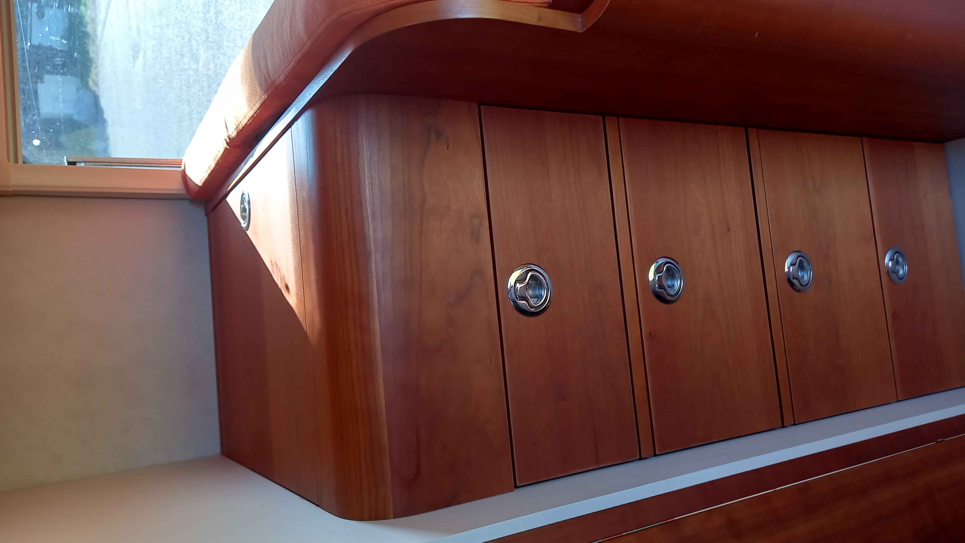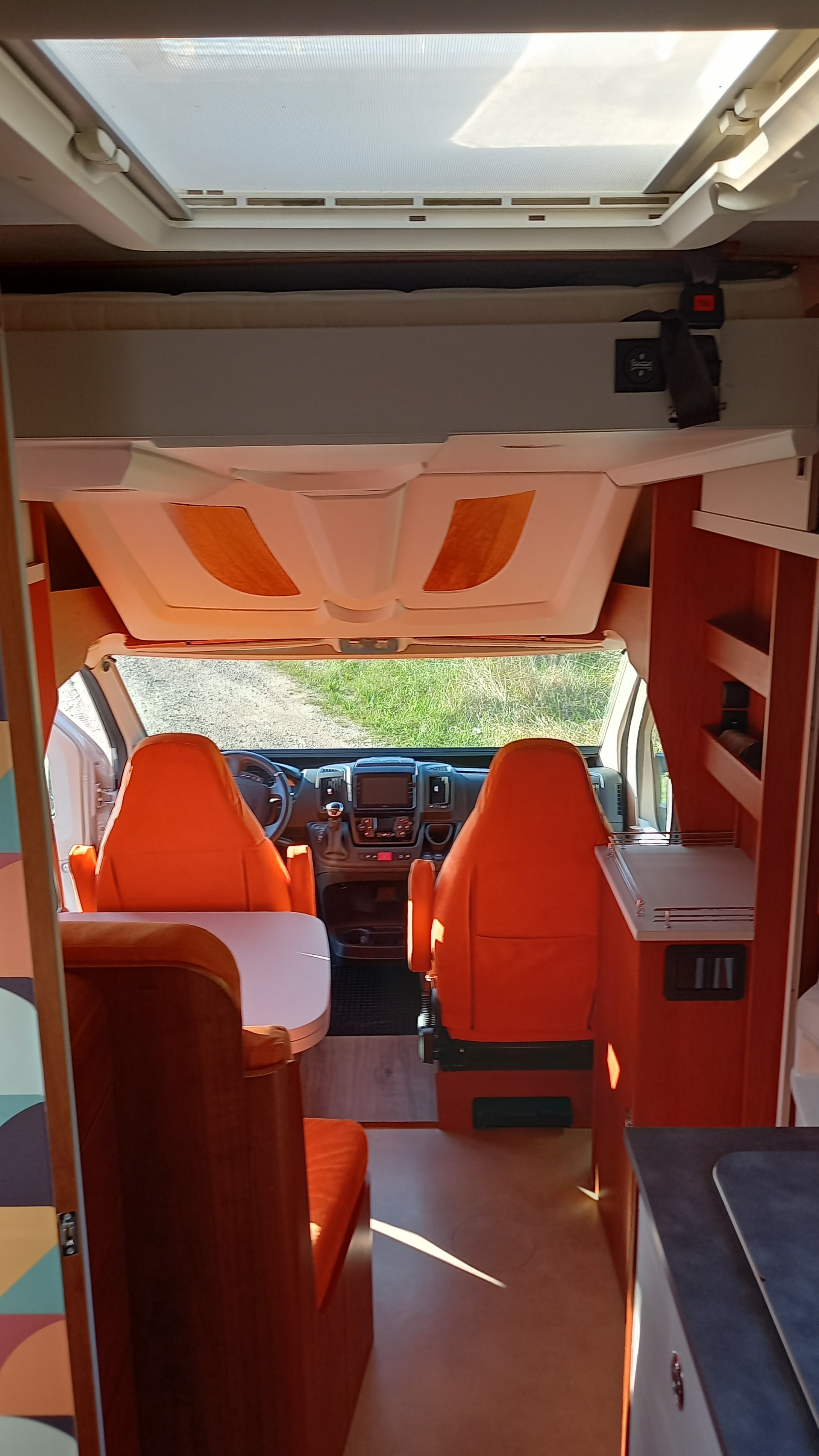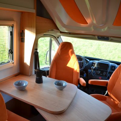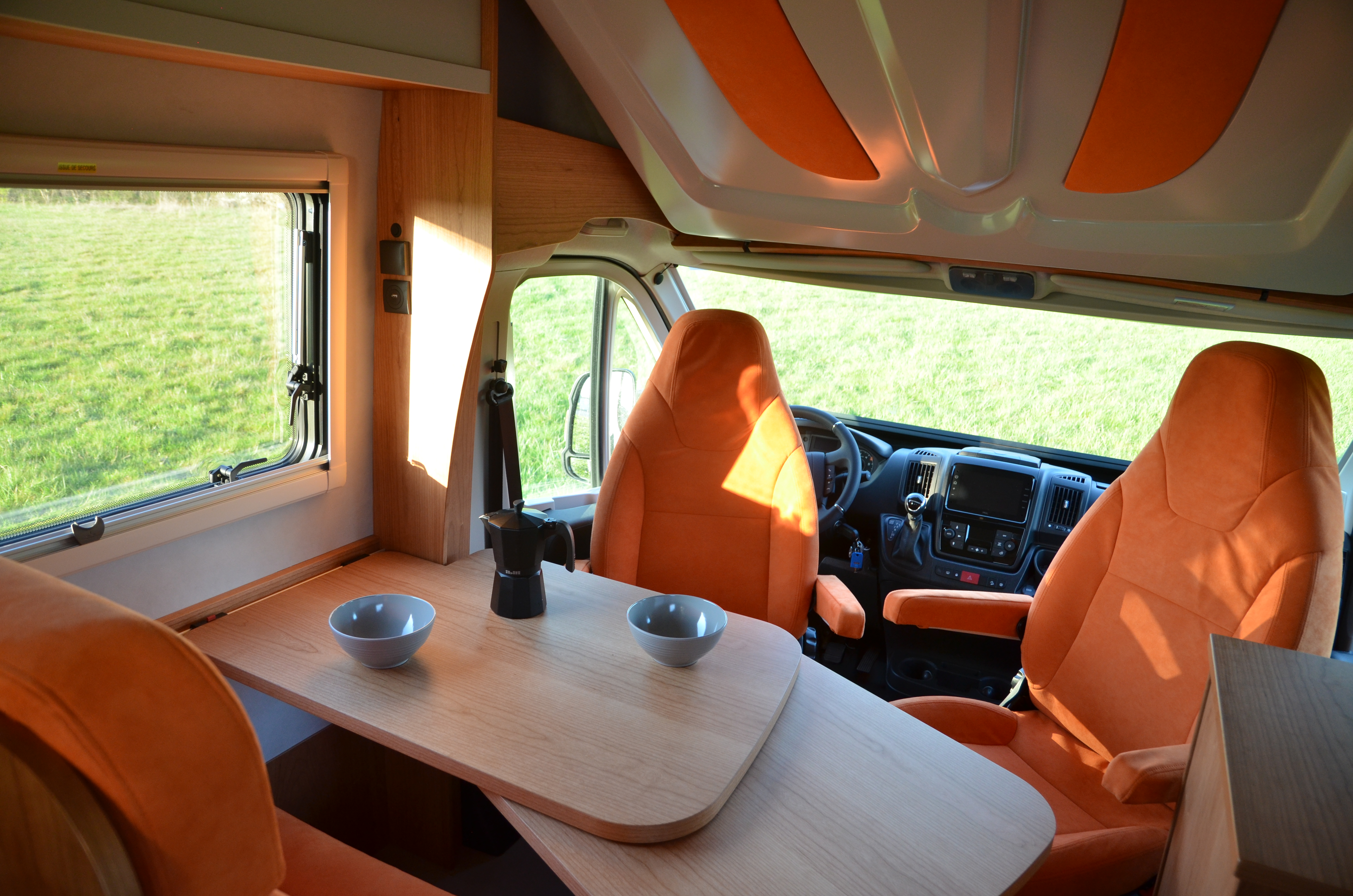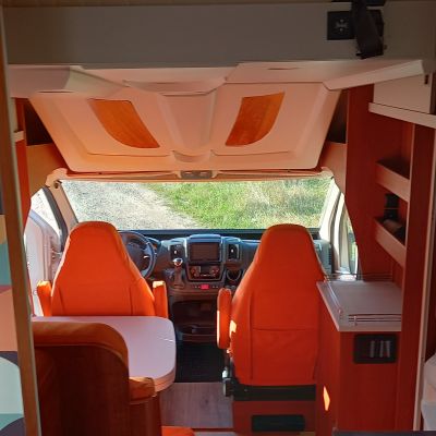 Salon composé d’une banquette 2 places face à la route et 2 sièges cabine pivotants.