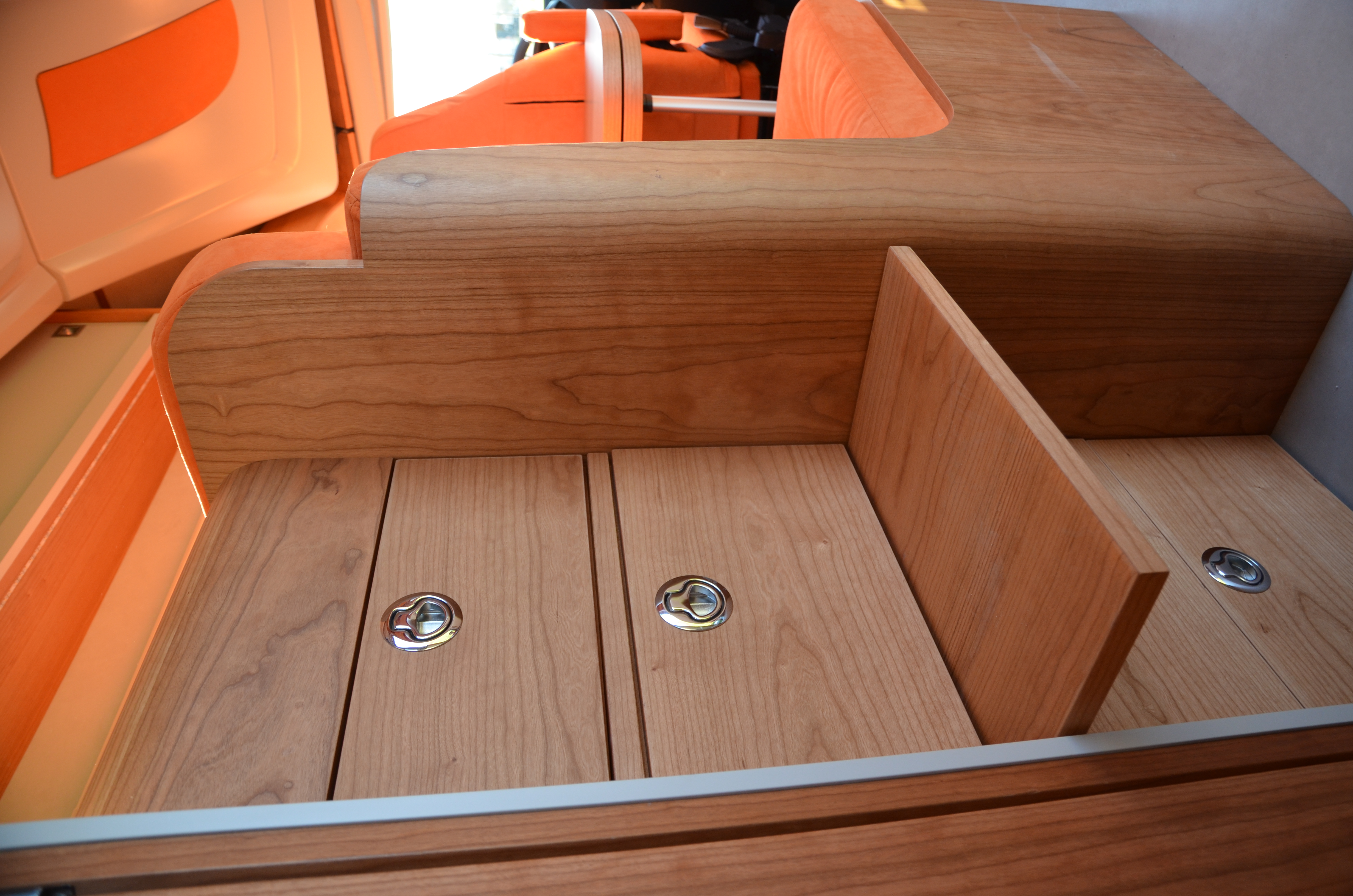 Paroi murale et plafond en revêtement Buflon et sellerie en microfibre.