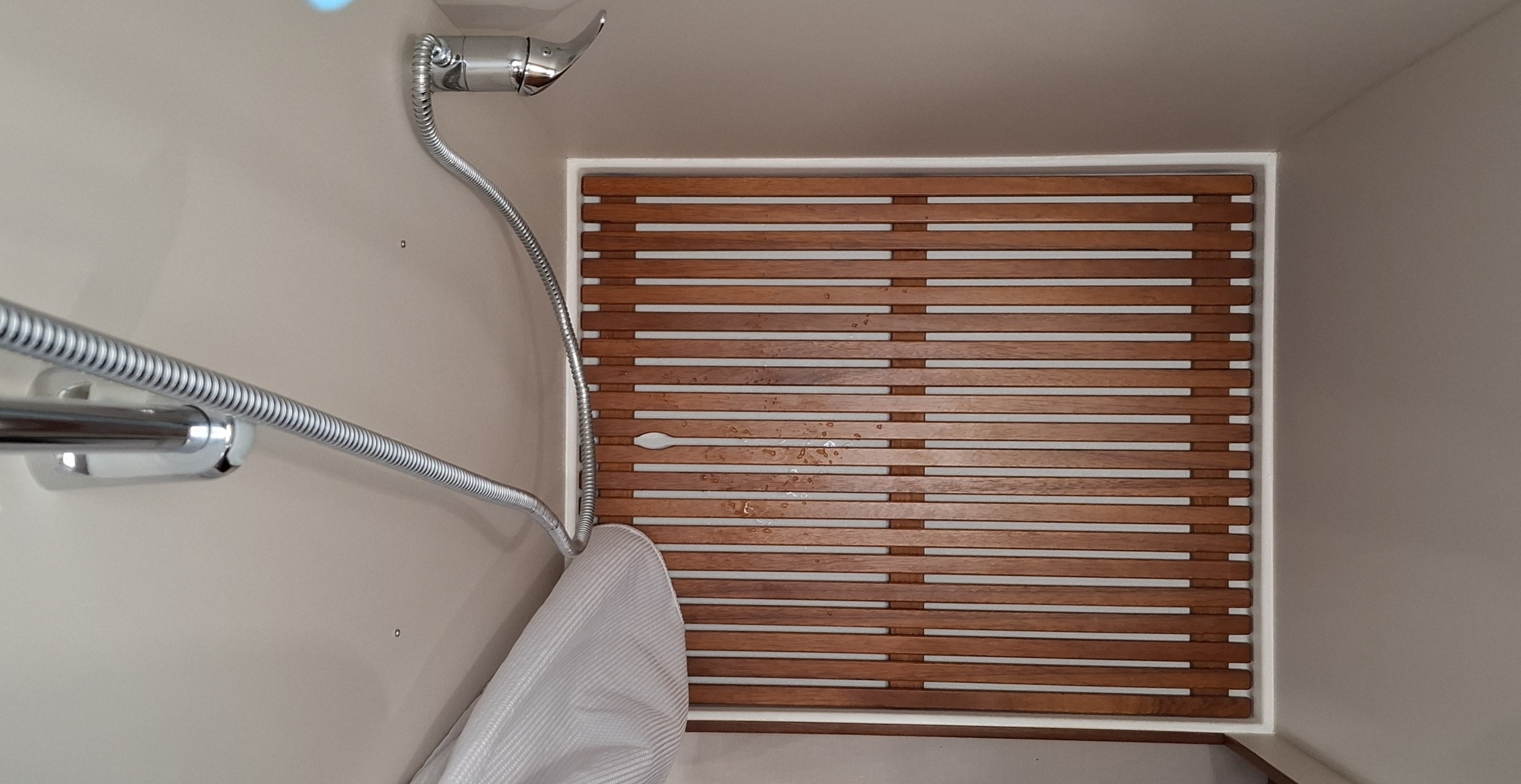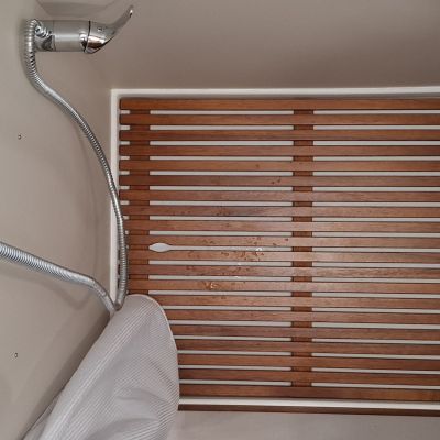 Douche avec bac en résine polyester séparée du cabinet de toilette avec WC à broyeur et évier inox, machine à laver 3Kg.