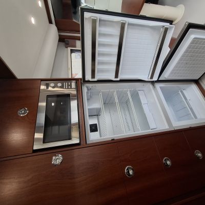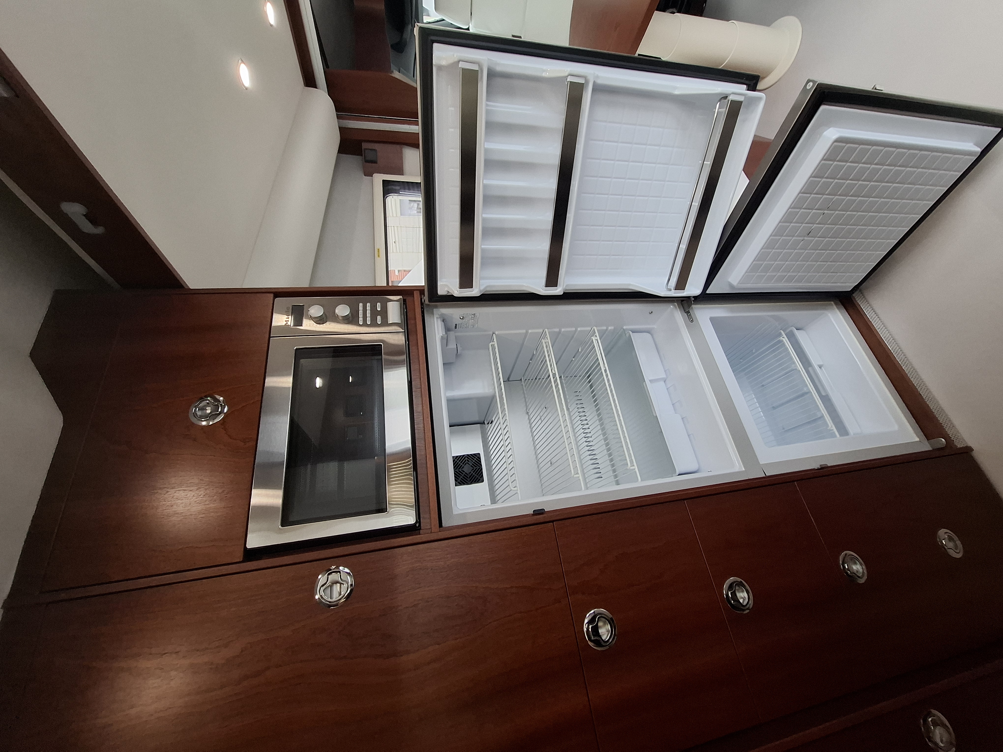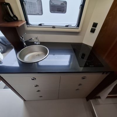 Cuisine équipée d’un réchaud 2 feux induction, évier inox, réfrigérateur/congélateur à compression 130L/65L, un four micro-onde et une tablette rabattable.