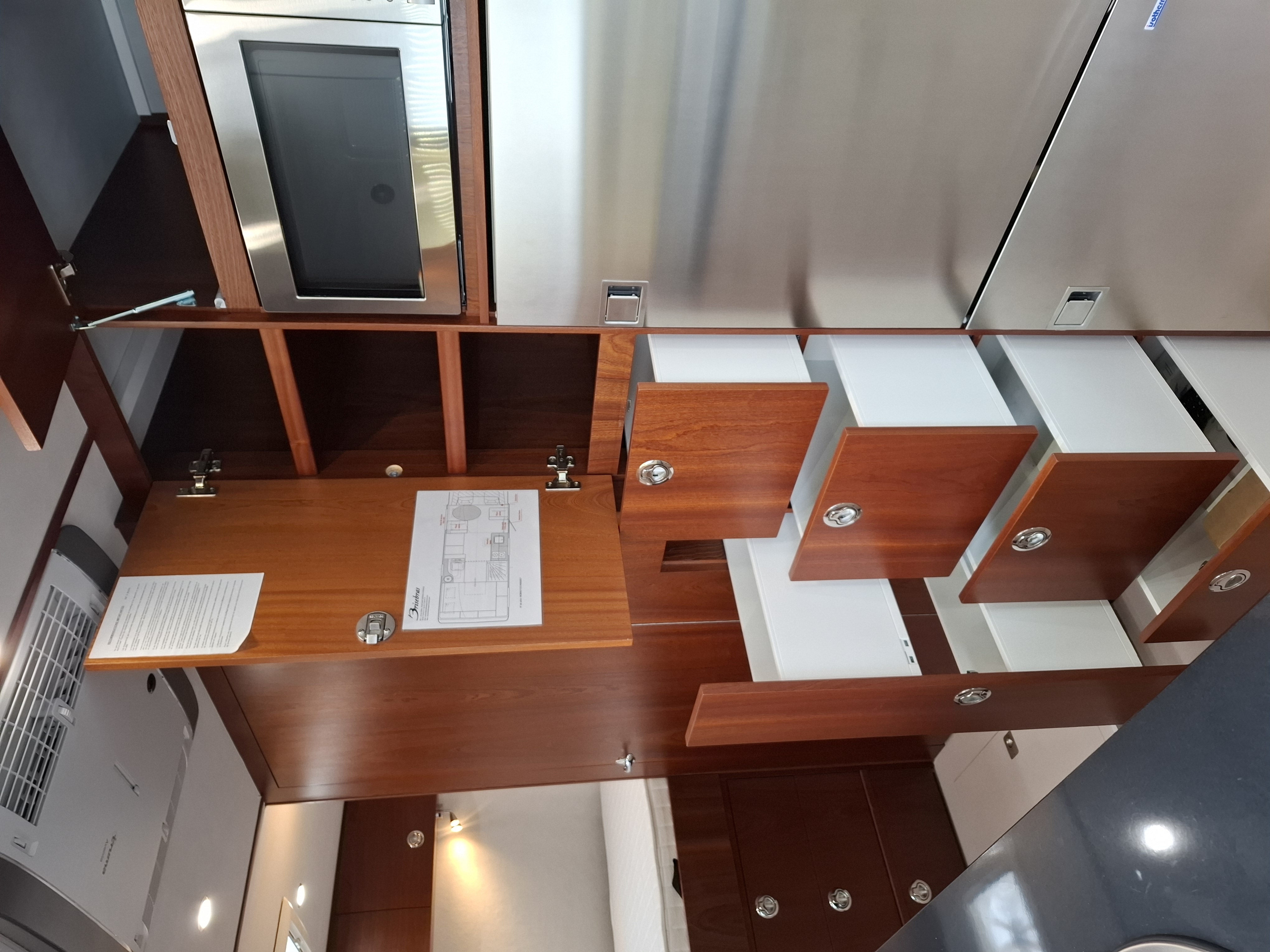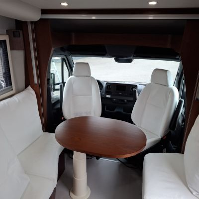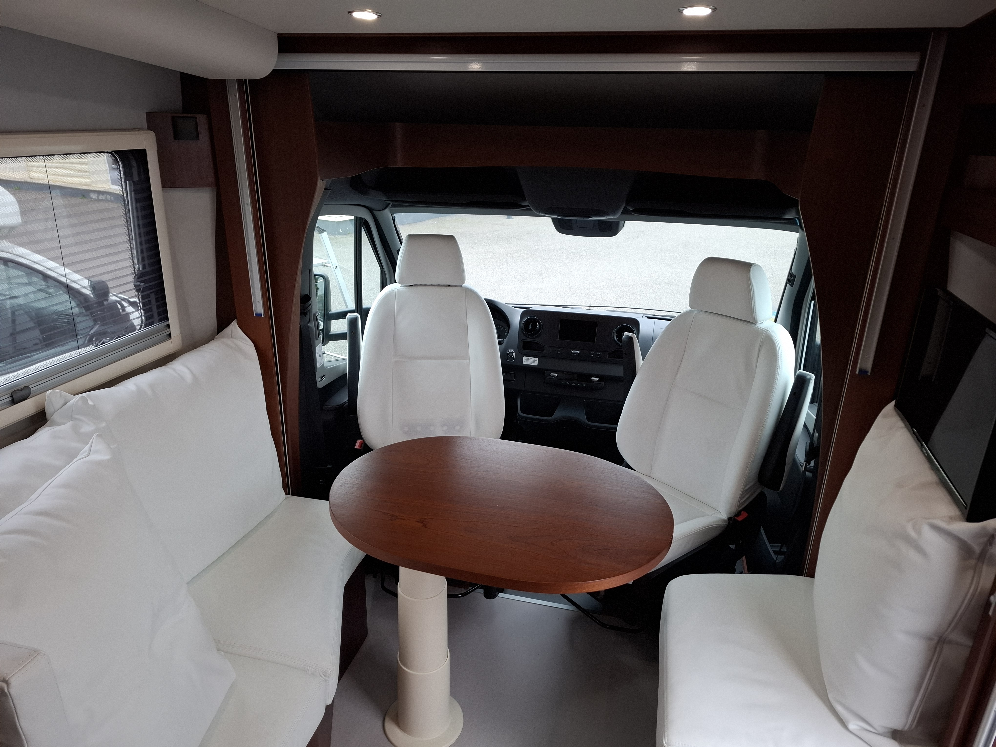 Salon composé de 2 banquettes latérales (transformable en place assise) avec 2 sièges cabine pivotants, une table ovale (100x63) sur pied télescopique, télévision.